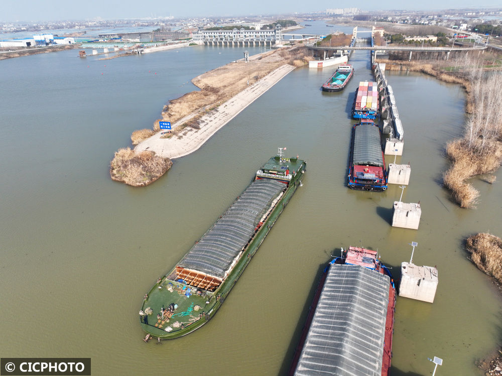 ↑2023年1月21日,货船有序通过安徽省芜湖市鸠江区合裕线航道裕溪船闸。(无人机照片)CICPHOTO/王玉实摄