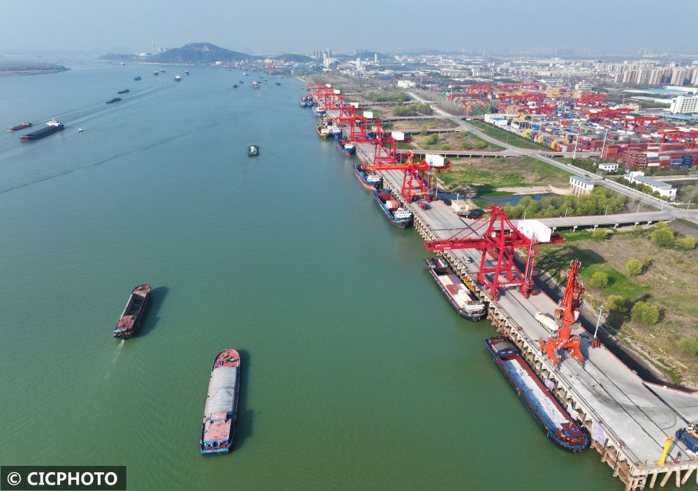 ↑2023年3月9日,安徽省芜湖港朱家桥港区国际集装箱码头,货轮在进行装卸作业。(无人机照片)CICPHOTO/王玉实摄