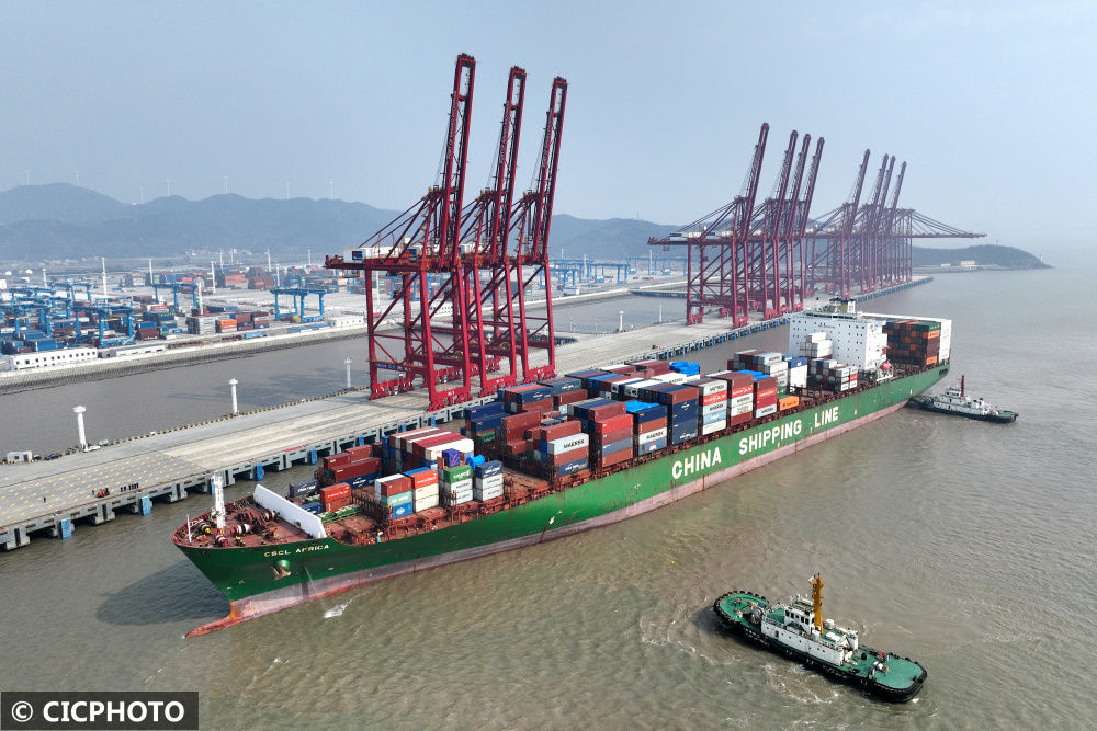 ↑2023年3月1日,一艘货轮在靠泊宁波舟山港金塘港区大浦口集装箱码头3号泊位。(无人机照片)CICPHOTO/姚峰摄
