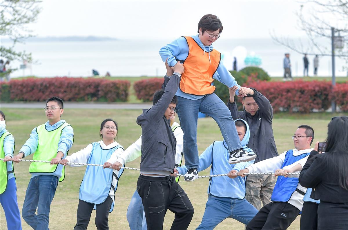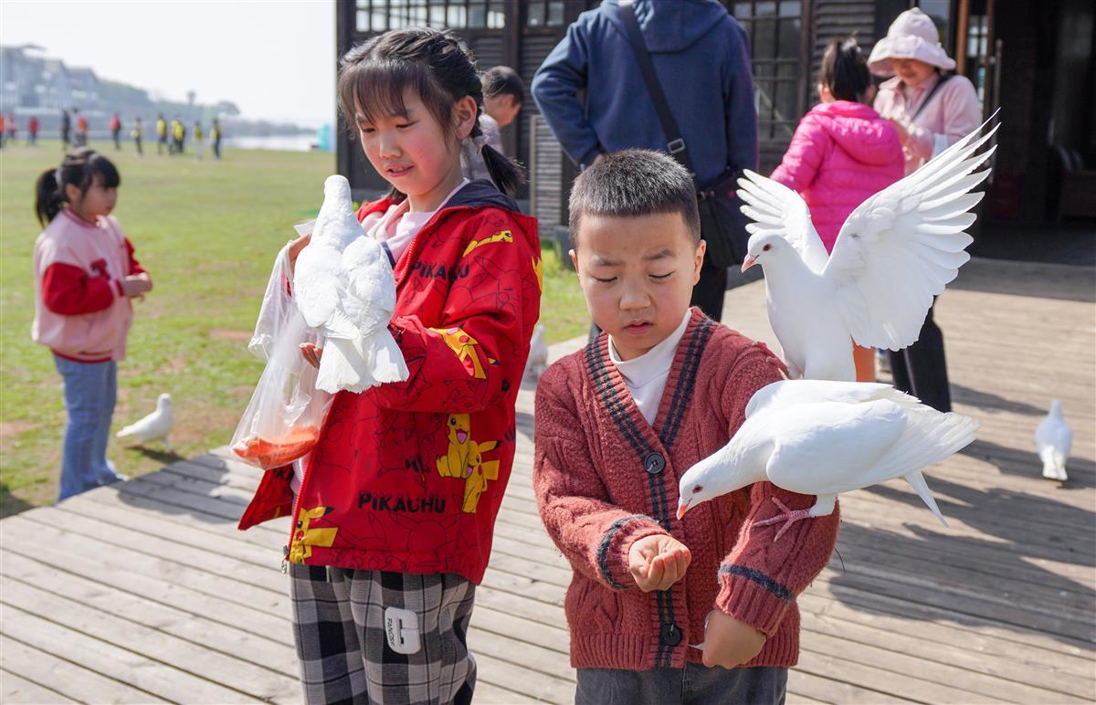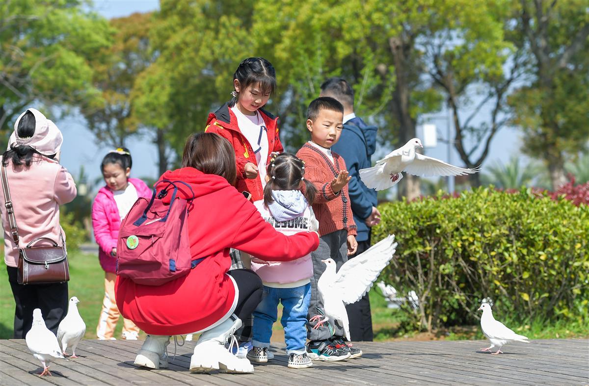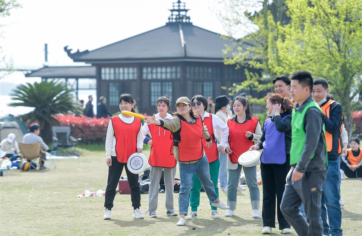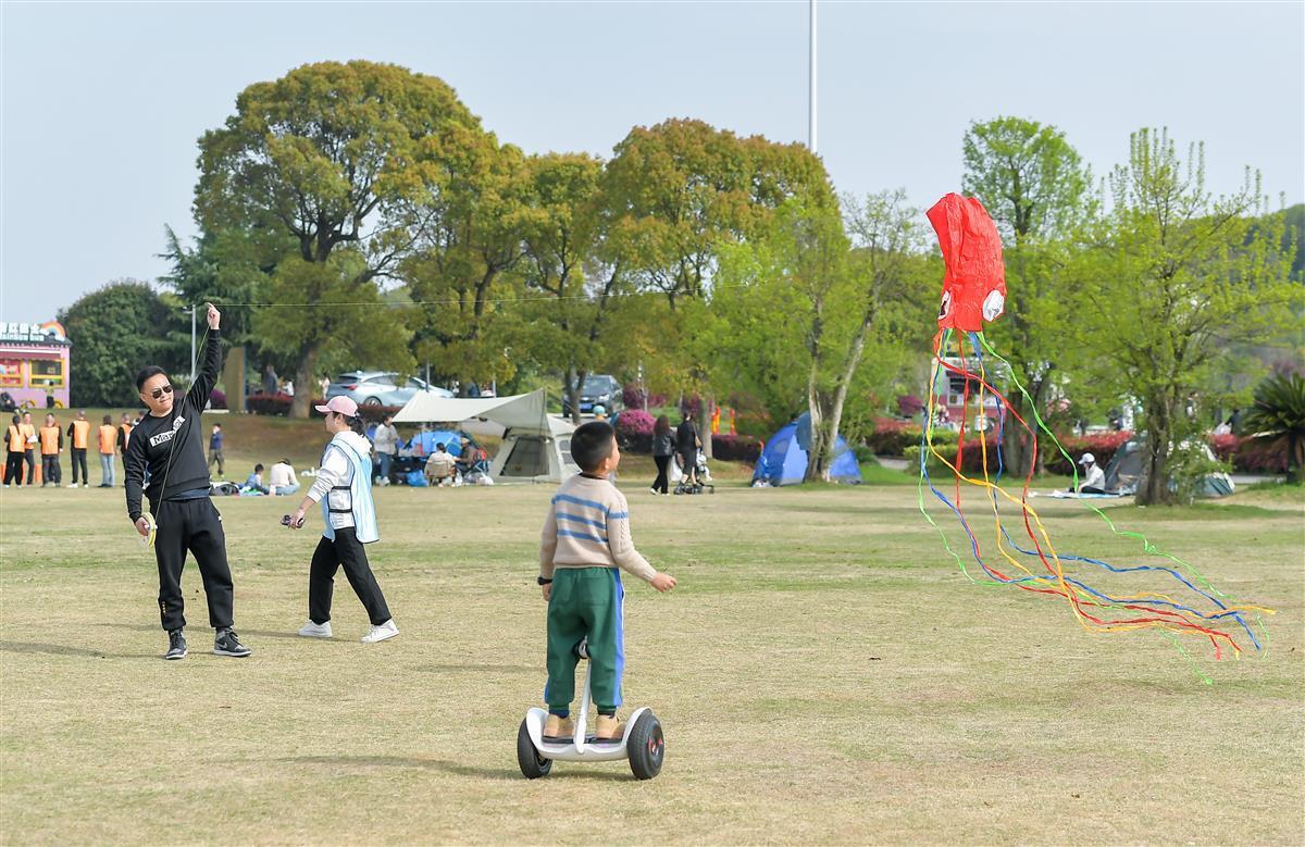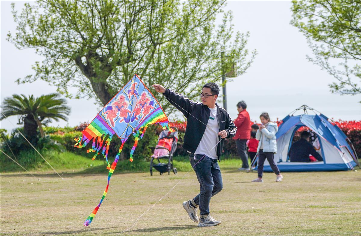 26日,极目新闻记者在武汉市江夏区梁子湖龙湾半岛景区看到,前来踏青的市民络绎不绝,有的搭帐篷露营,有的在草坪上放风筝,有的湖边喂鸽子,有的在搞拓展训练……大家都在尽情享受明媚的春光。