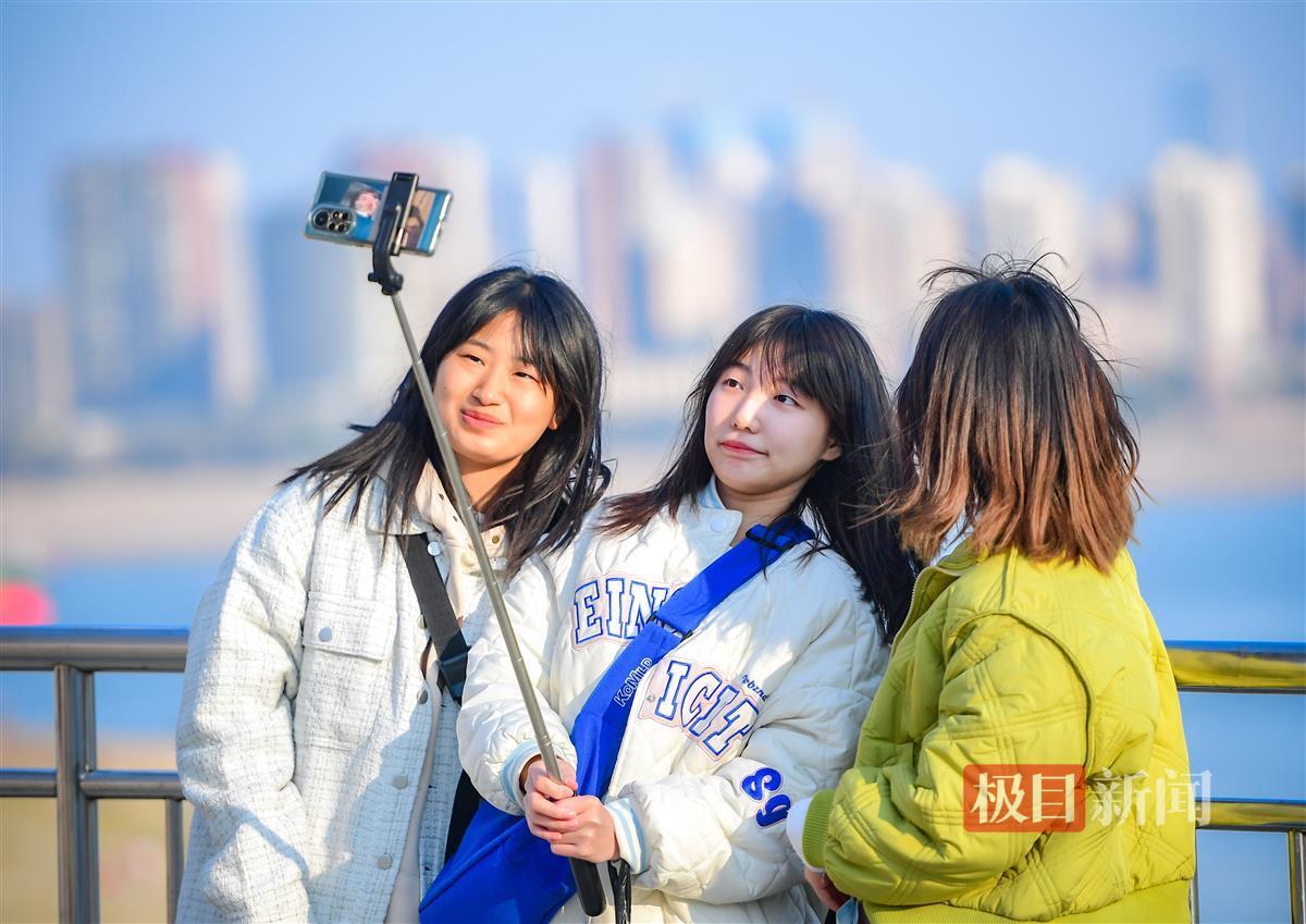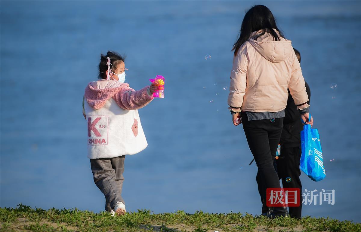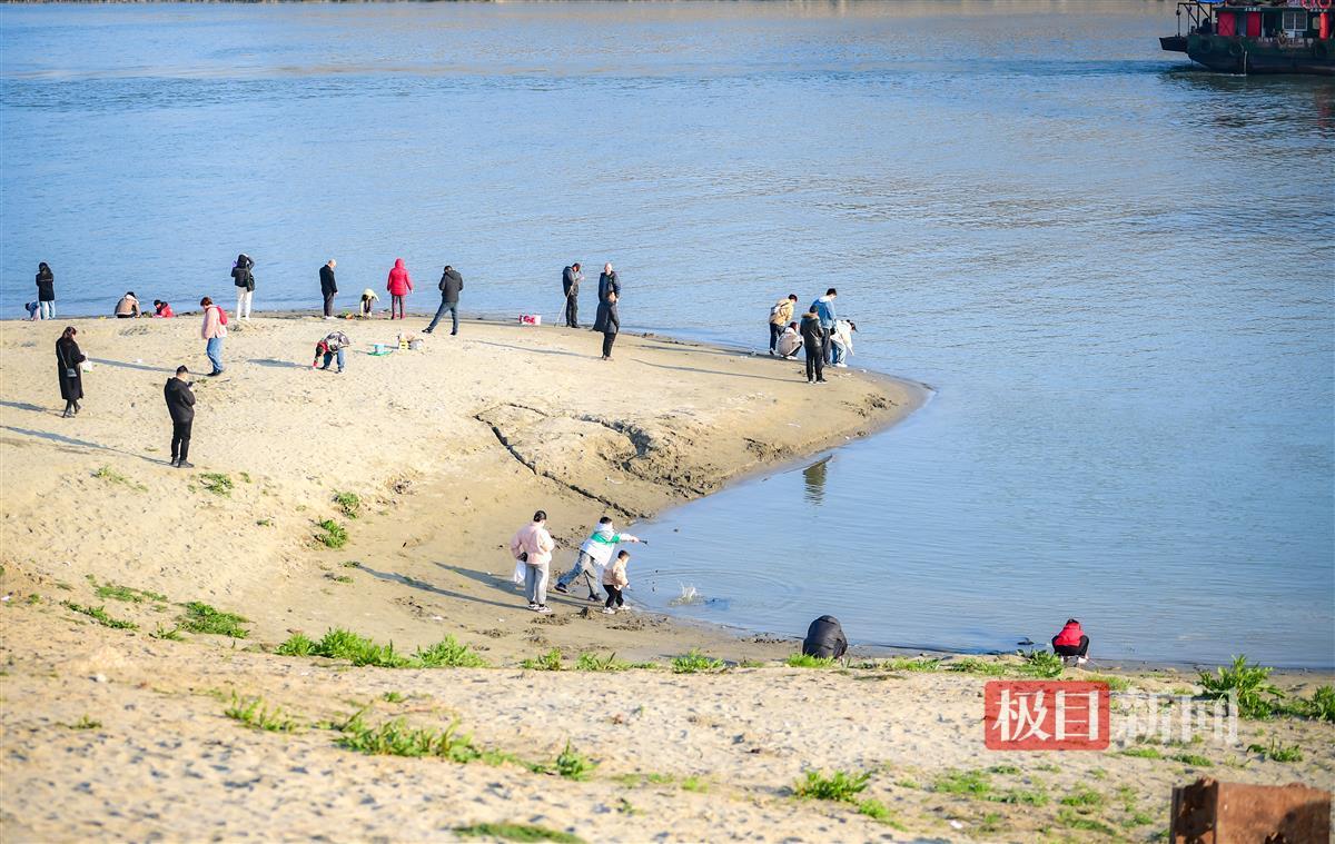阳光映射着长江,碧波荡漾,江水拍打着浅浅的滩涂,江面像海景一样波澜壮观,两江四岸迎来了一波又一波的市民前来打卡游玩。