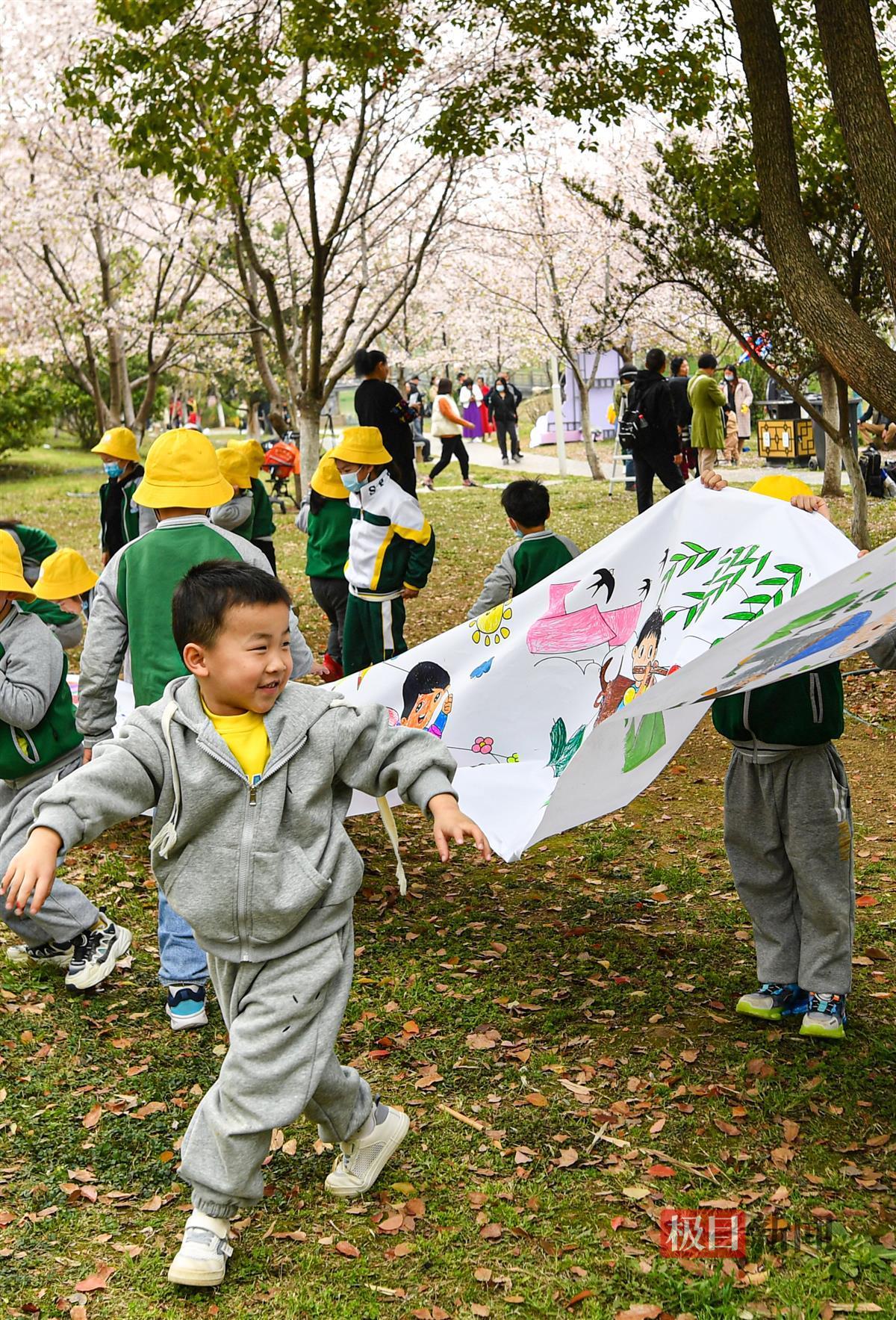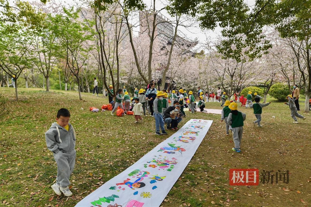 3月28日,武汉堤角公园,一家幼儿园把课堂搬进公园,让小朋友在春天里描绘春天。树林里,樱花绽放,桃花盛开,踏春赏花的人络绎不绝。长长的画布上,小朋友用五彩的颜料描绘春天的景色:清风吹拂、杨柳吐绿、燕子归来、风筝起舞、快乐的小朋友张开双臂,迎接春天的到来!