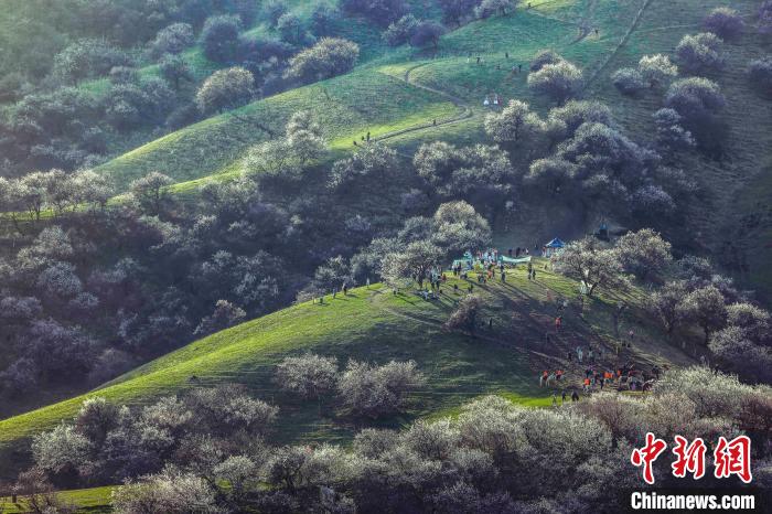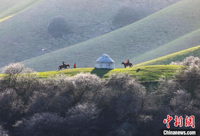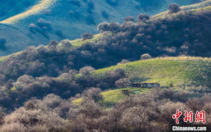 4月,和煦的春风吹醒了沉睡的大地。也吹开了新疆新源县那拉提杏花谷里的野杏花。在绵延起伏十几公里的山谷间花开正艳。山谷中间刚刚被春草染上了一抹绿色,一树树绽放的野生杏花如同用画笔点染在绿色画布上。马牛羊悠闲地在杏花林中吃草。草原的新绿搭配杏花的粉嫩,再点缀以牧民的毡房和悠闲的牛羊,引来八方游客纷纷走进杏花谷,欣赏粉白的杏花。