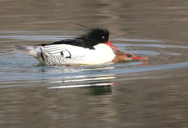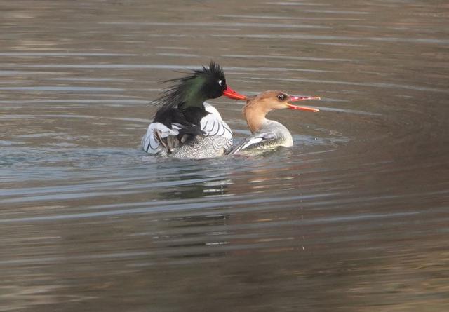 两只中华秋沙鸭在二道白河镇美人松湖里交尾。新华社发(王景和摄)