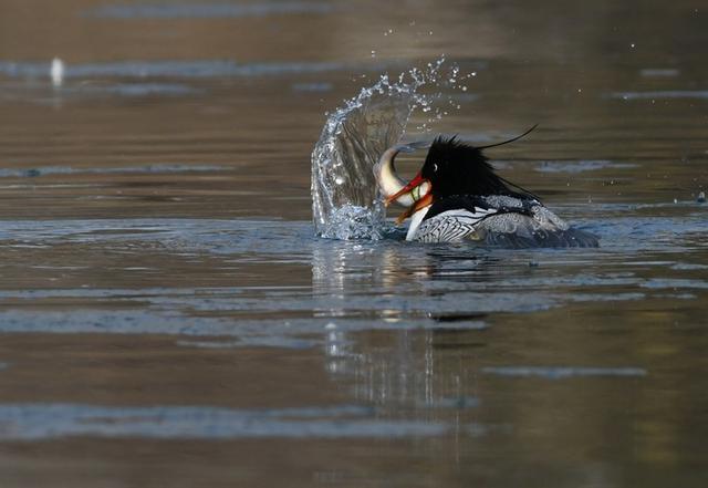 一只雄性中华秋沙鸭在二道白河镇美人松湖里捕鱼。新华社发(王景和摄)