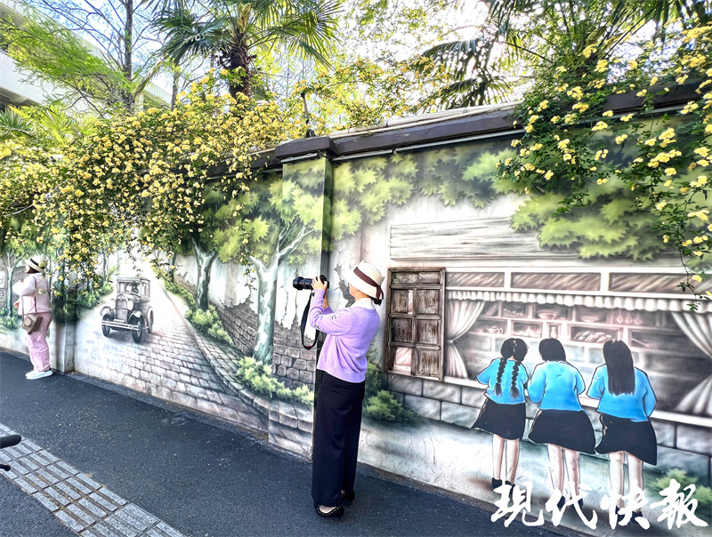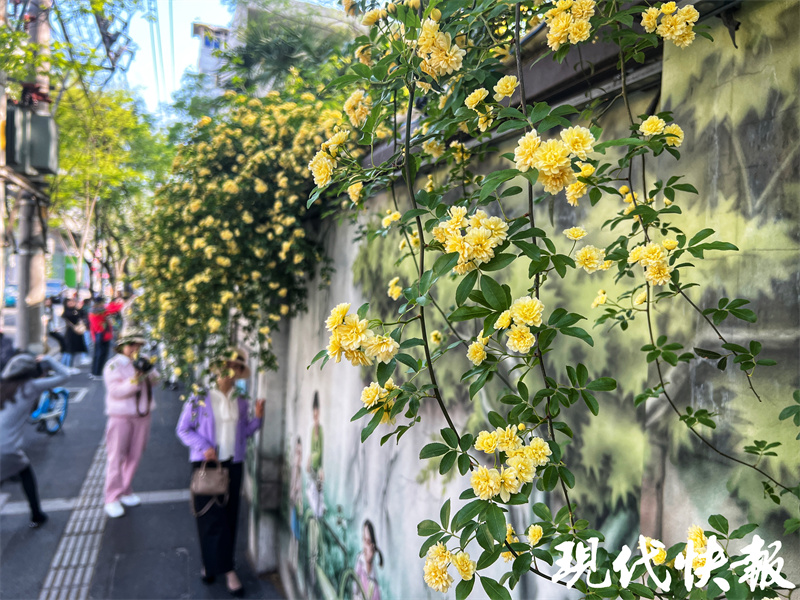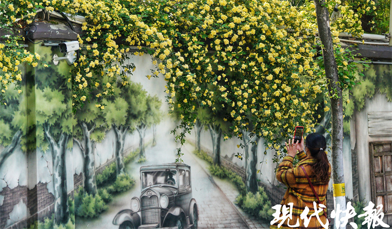 现代快报讯(记者王新月/文赵杰/摄)近日,南京玄武区碑亭巷的木香花盛开,花开处有近百米富有市井风情的“碑亭印记”墙绘。乍一看,这些木香花像是从画里长出来似的,市民纷纷结伴打卡。