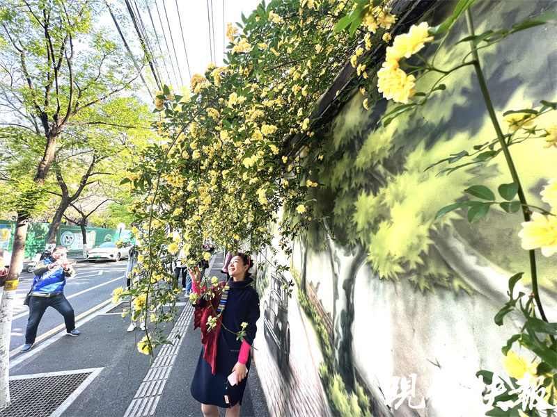 据现代快报此前报道,这是南京外国语学校太平北路校区的木香树伸出来的花枝。明黄的木香花与特色墙绘相互映衬,成了南京春季的网红打卡点。4月8日,现代快报记者来到碑亭巷,这巷子看起来是寻常巷陌,但在近百米富有市井风情的“碑亭印记”墙绘处,有不少人在赏花拍照。记者粗略数数,有50多人,他们或拿有相机、三脚架,或穿着精致,还有身着中学生校服的情侣在拍写真。墙绘周边停放着几辆共享单车,甚至有的单车也被“入画”,成为拍照道具。