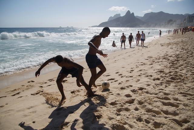 ↑2022年12月15日,两名男孩在里约热内卢依帕内玛海滩上踢足球。