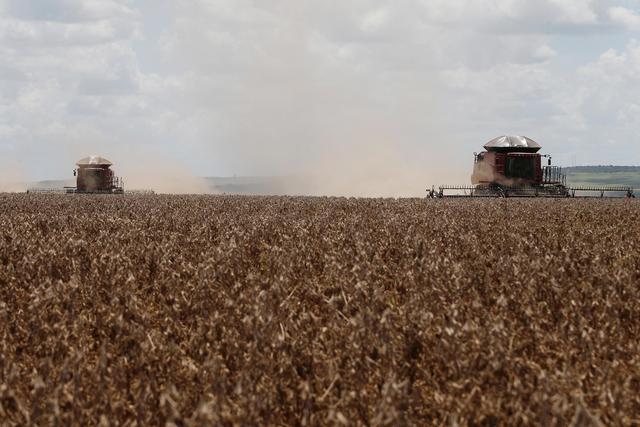 ↑2023年2月11日,在巴西利亚附近的纳蒂瓦农场,农民驾驶农机收割大豆。