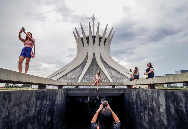 ↑2019年11月2日,游客在巴西利亚大教堂外拍照留念。