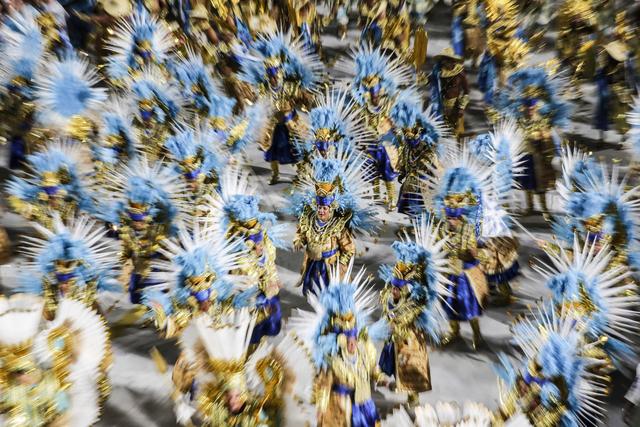 ↑2023年2月26日凌晨,在里约热内卢桑巴大道,桑巴舞校的演员参加狂欢节游行。每年狂欢节,巴西各地都举行规模不等的庆祝活动,其中最负盛名的是里约狂欢节桑巴大道竞演。