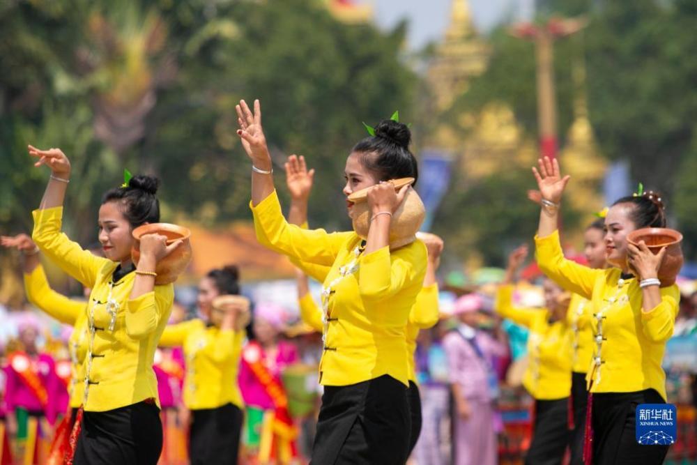 4月12日,表演者在芒市泼水节开幕式上进行非遗项目展演。当日,云南省德宏傣族景颇族自治州芒市2023年泼水狂欢节开幕,人们相互泼洒代表幸福、吉祥的清水,表达着相互间的无限祝福。新华社记者 崔文 摄