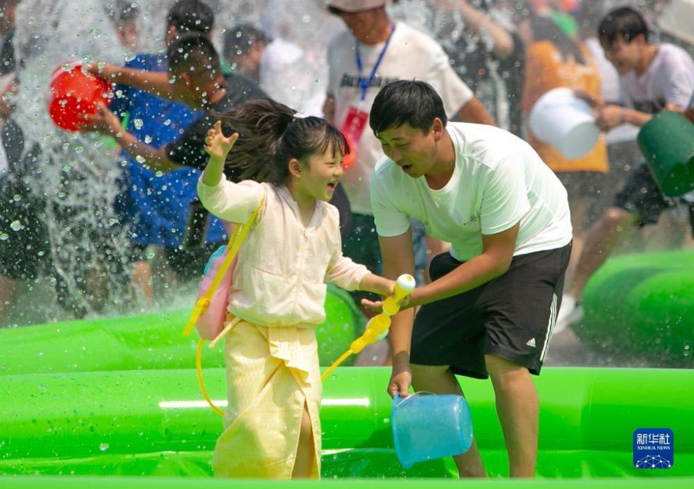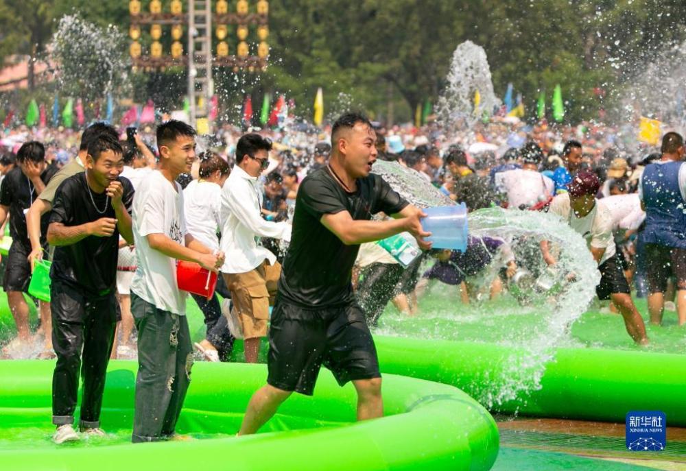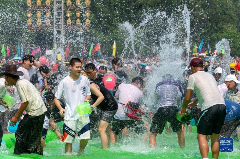 4月12日,人们在芒市广场庆祝泼水节。当日,云南省德宏傣族景颇族自治州芒市2023年泼水狂欢节开幕,人们相互泼洒代表幸福、吉祥的清水,表达着相互间的无限祝福。新华社记者 崔文 摄