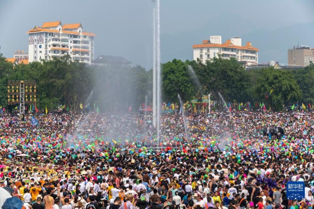 这是4月12日拍摄的芒市广场泼水节现场。当日,云南省德宏傣族景颇族自治州芒市2023年泼水狂欢节开幕,人们相互泼洒代表幸福、吉祥的清水,表达着相互间的无限祝福。新华社记者 陈欣波 摄