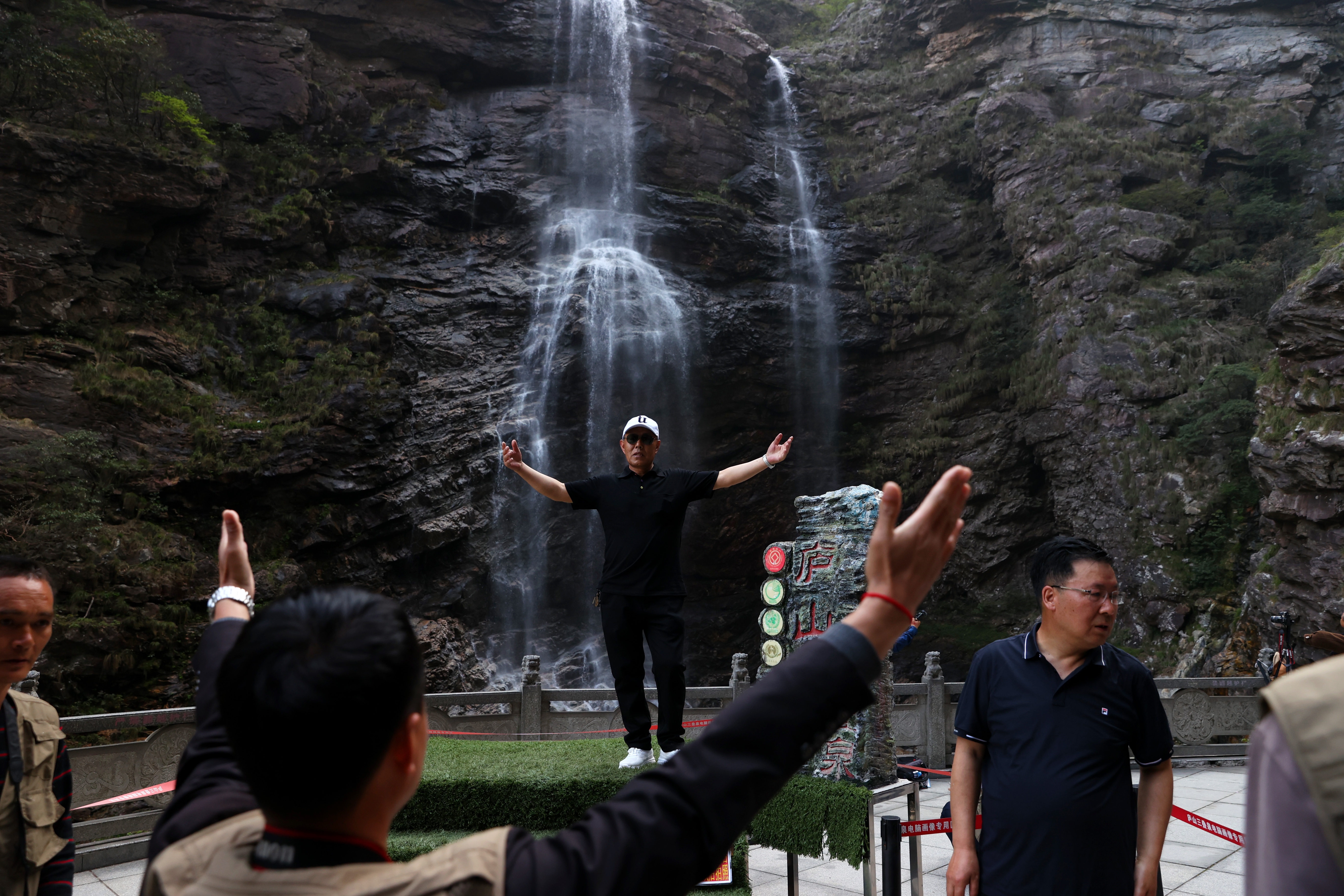 4月12日,游客在庐山三叠泉瀑布旁拍照。中国日报记者姜东摄