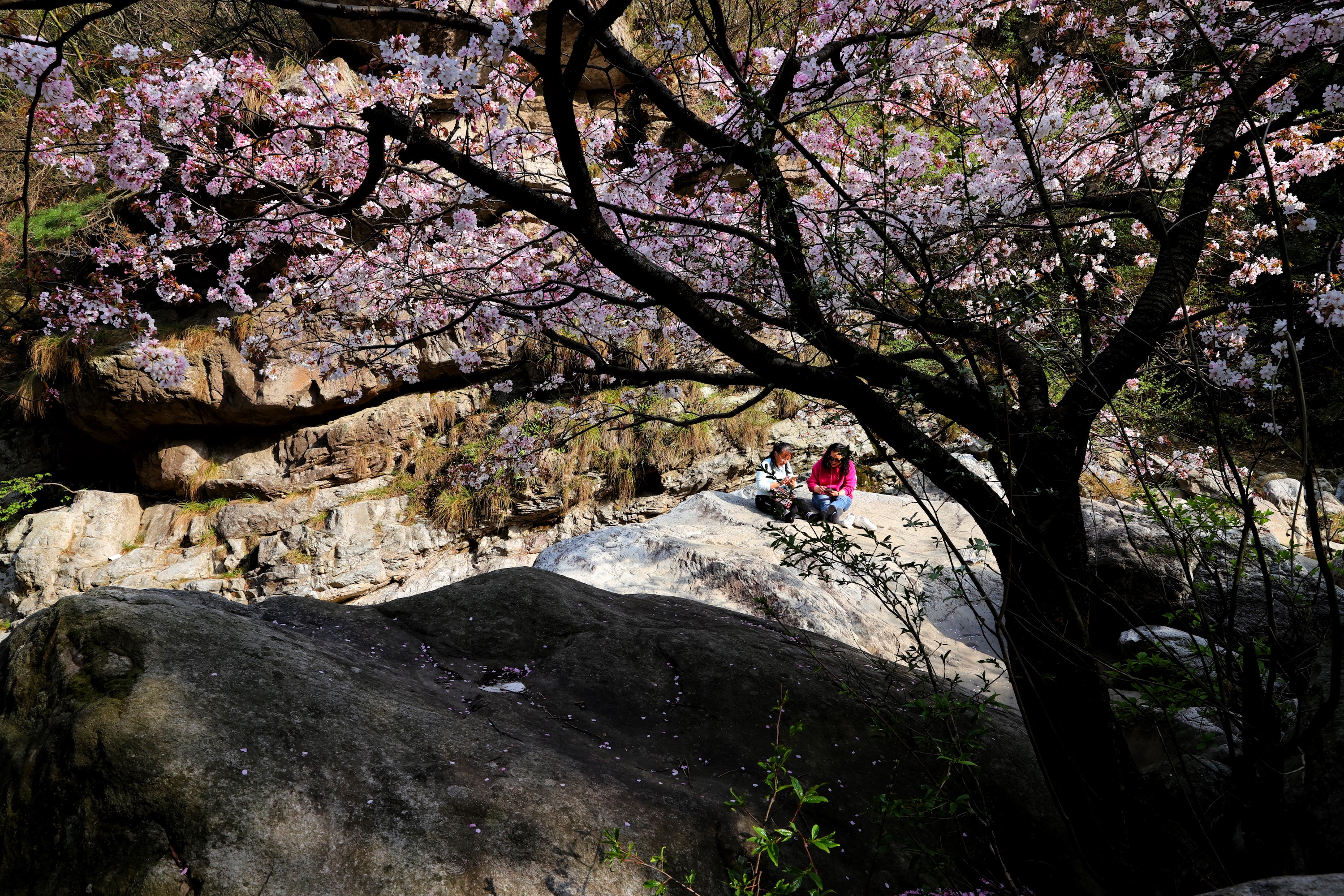 4月12日,游客在庐山小溪畔游玩休憩。中国日报记者姜东摄