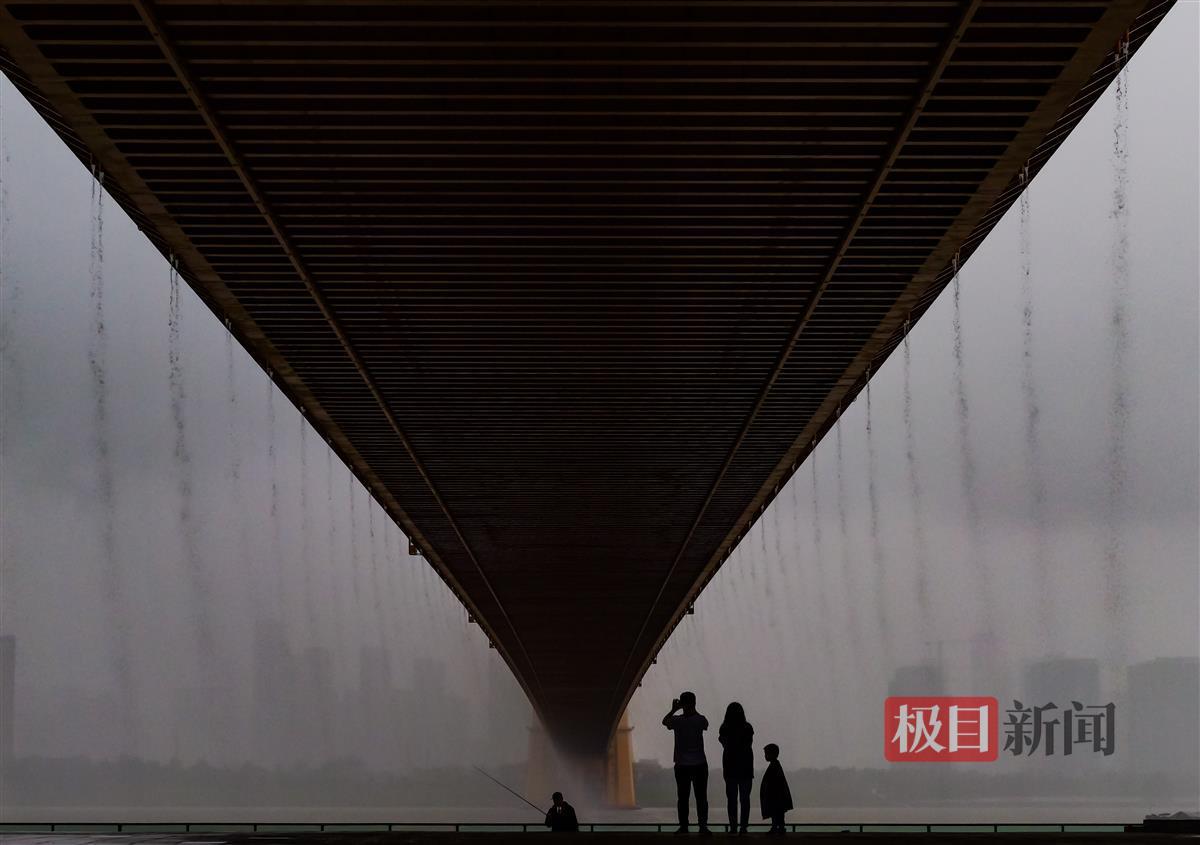4月22日,武汉大雨,杨泗港长江大桥底部两侧再现水帘瀑布奇景。