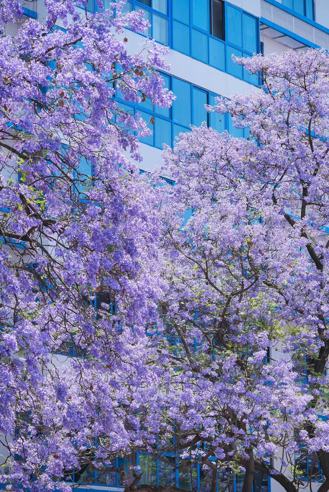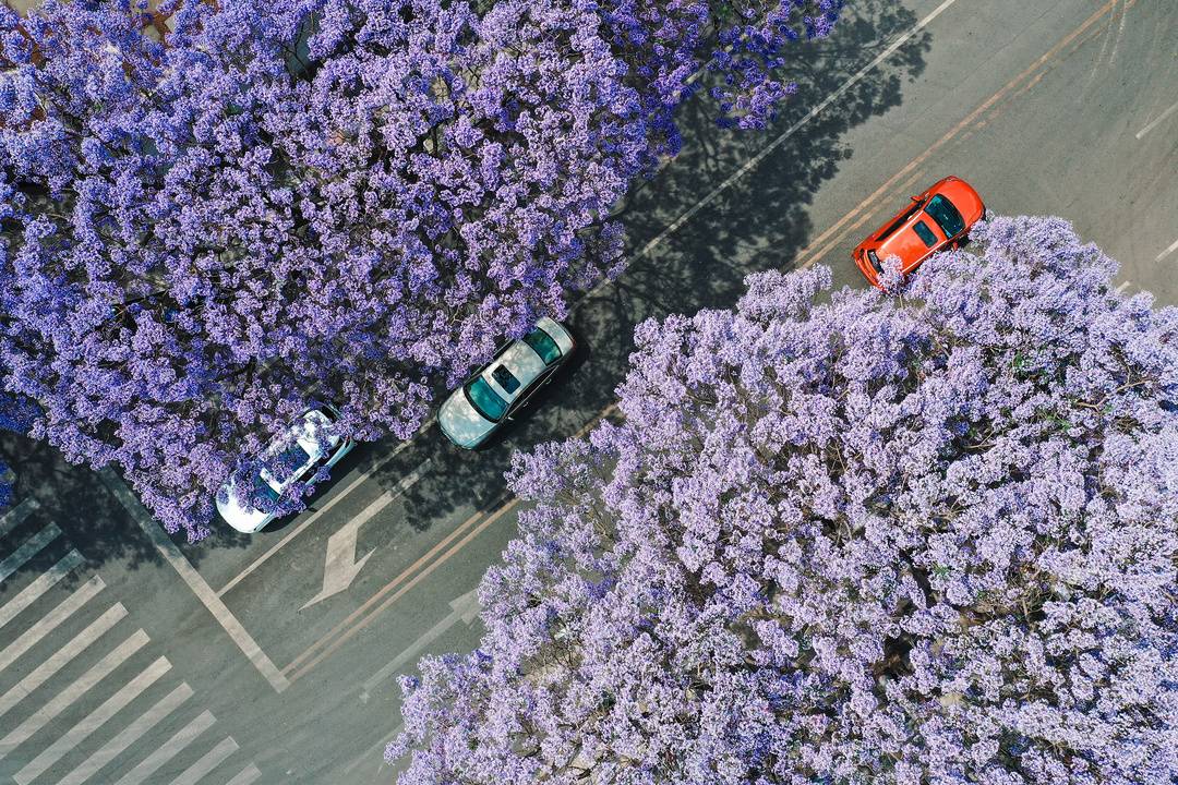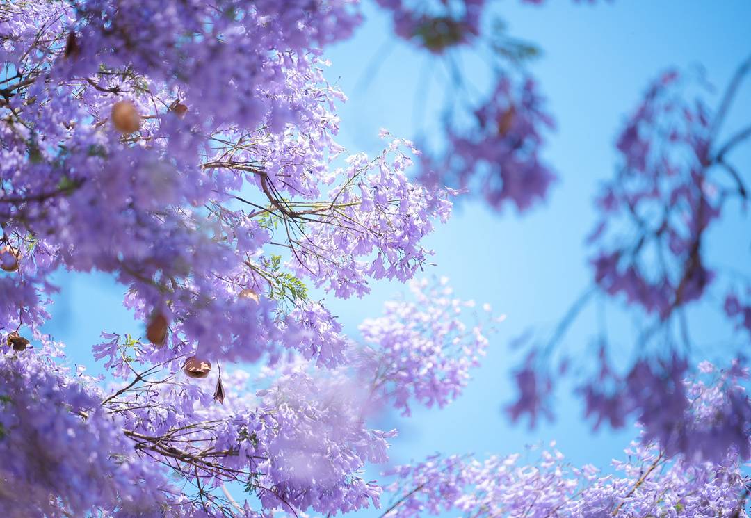 春日暖阳下,航天北路上的蓝花楹摇曳生姿。