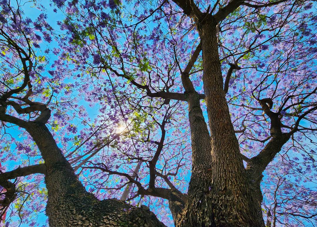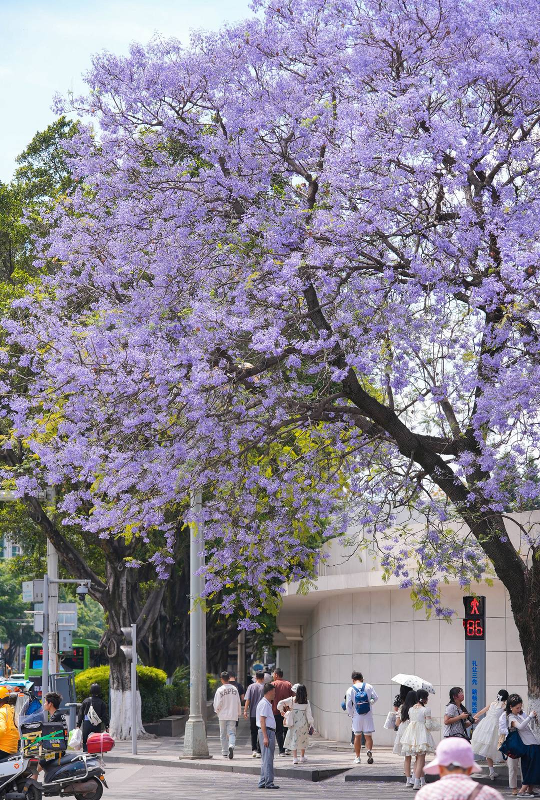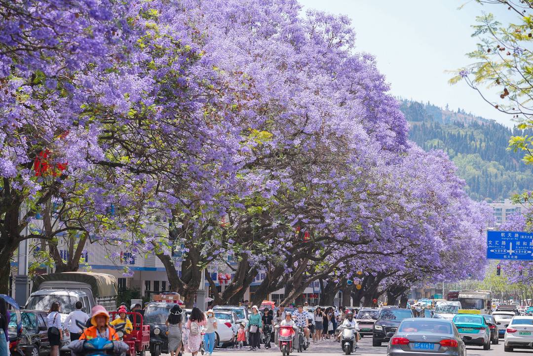 蓝花楹是西昌市的市树。1994年,被称为西昌“蓝花楹之父”的那剑新,从泸州引进了一批蓝花楹树苗,种在了航天北路。29年过去,这批蓝花楹已经长成米径超过70厘米的大树,航天北路也成为了西昌4月最具人气的网红打卡地。