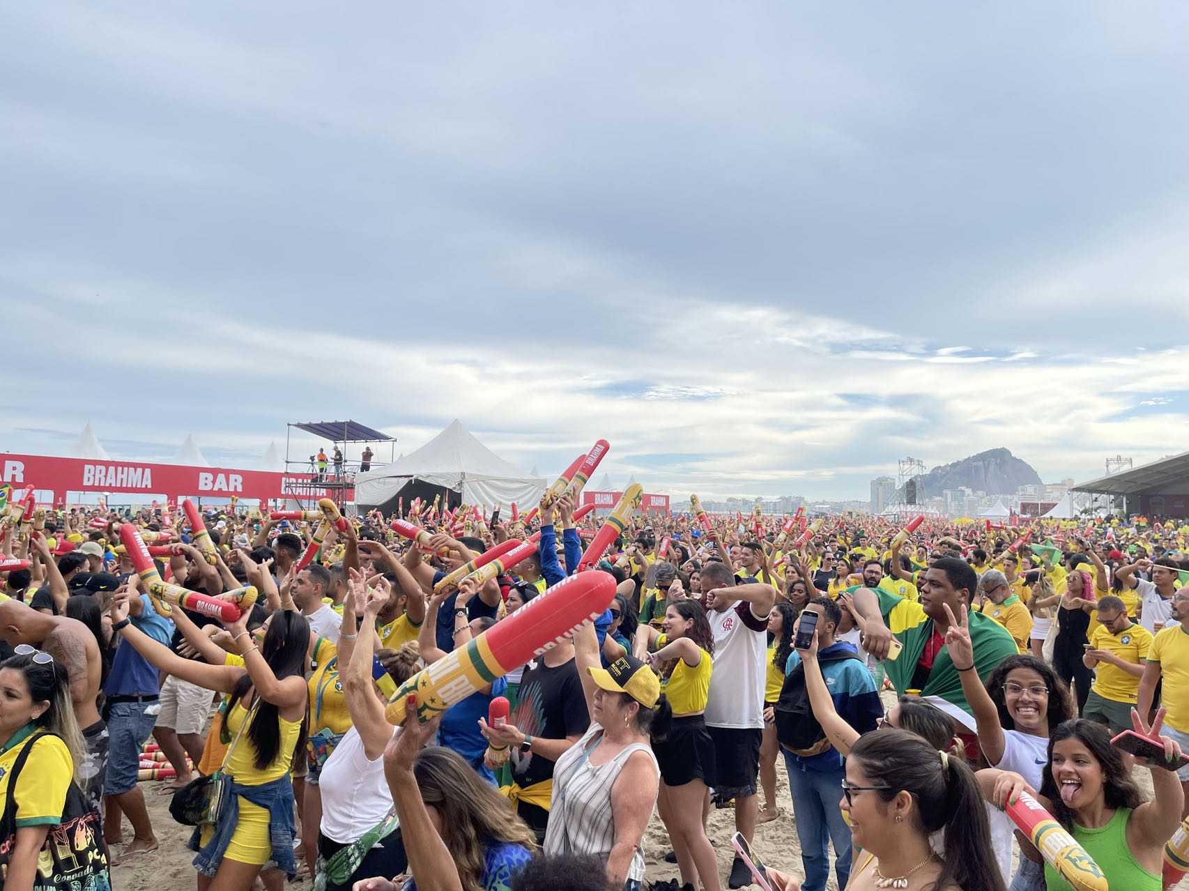 2022年11月24日,巴西球迷在国际足联官方活动场地科帕卡巴纳海滩观看巴西对阵塞尔维亚的首场比赛(记者汤晔摄)