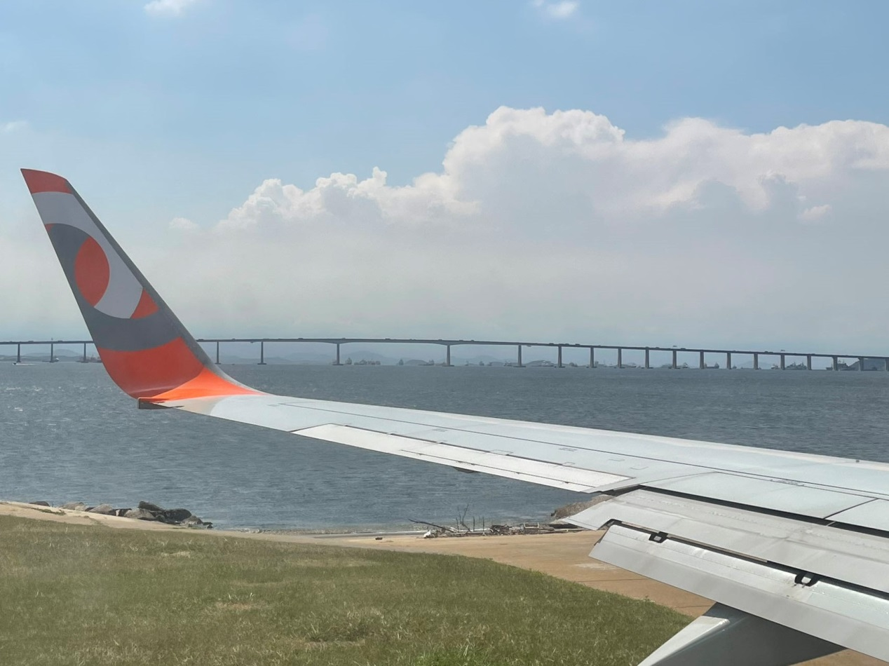 加利昂国际机场,背景为南半球最长跨海大桥——里约-尼泰罗伊大桥(记者汤晔摄)