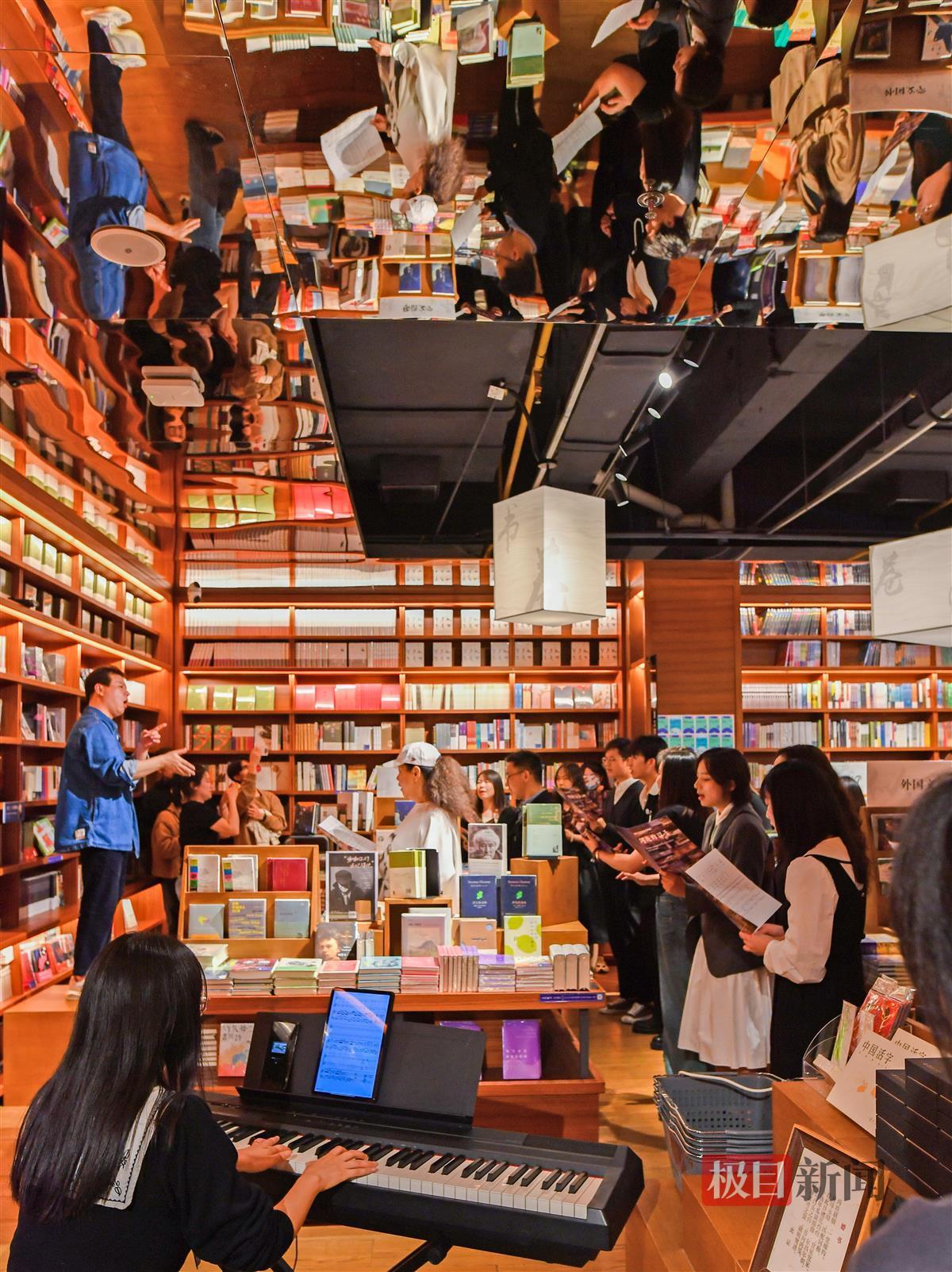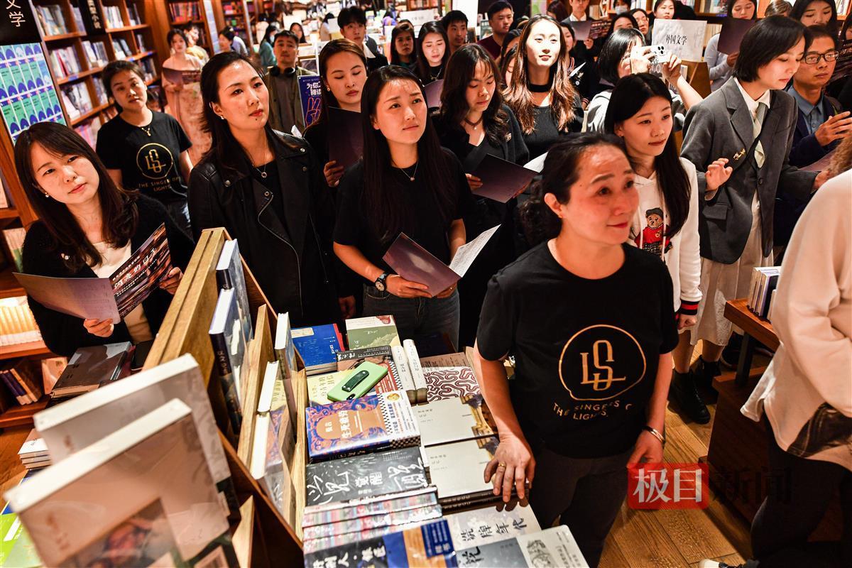 4月29日晚,上海三联书店·READWAY(武汉店)3F艺文空间,微光室内合唱团和30名书友共同体验快闪合唱,他们演唱的歌曲是罗大佑的《闪亮的日子》。