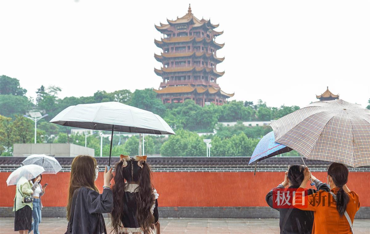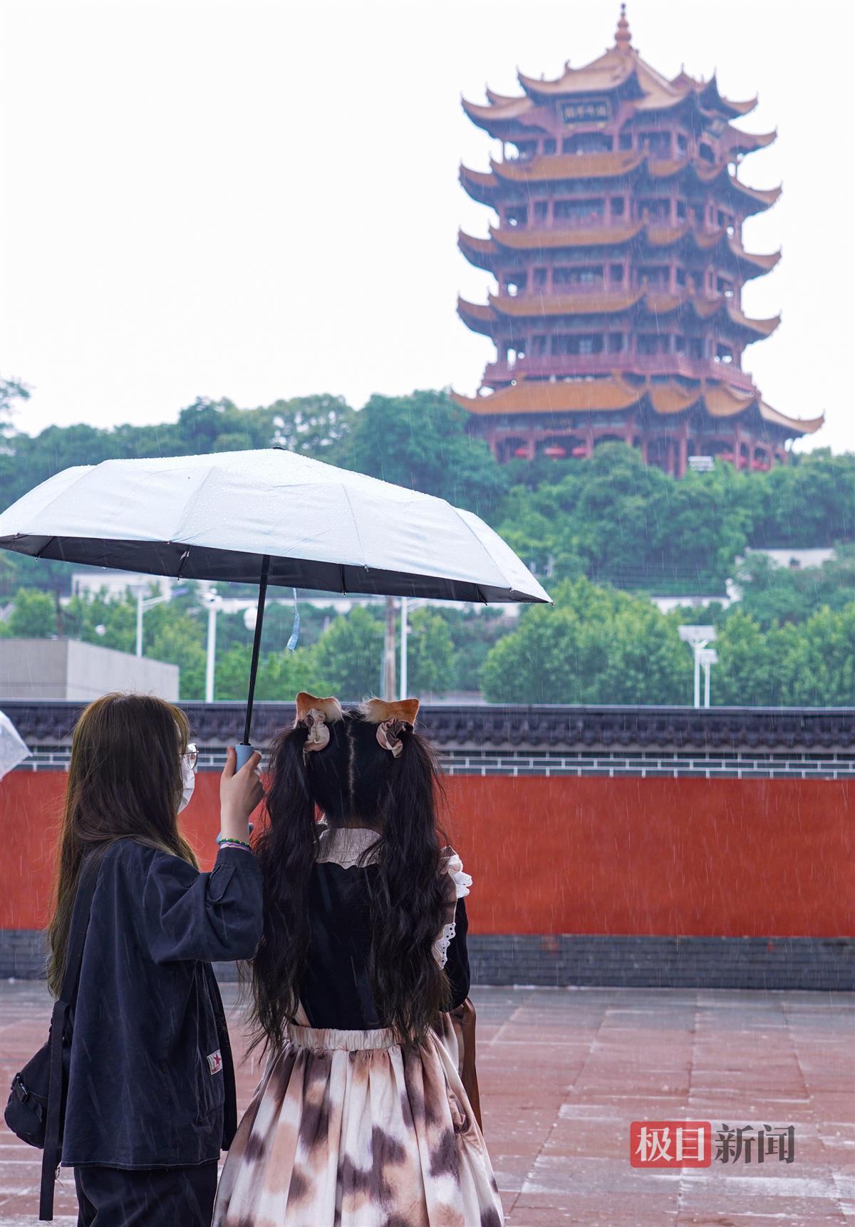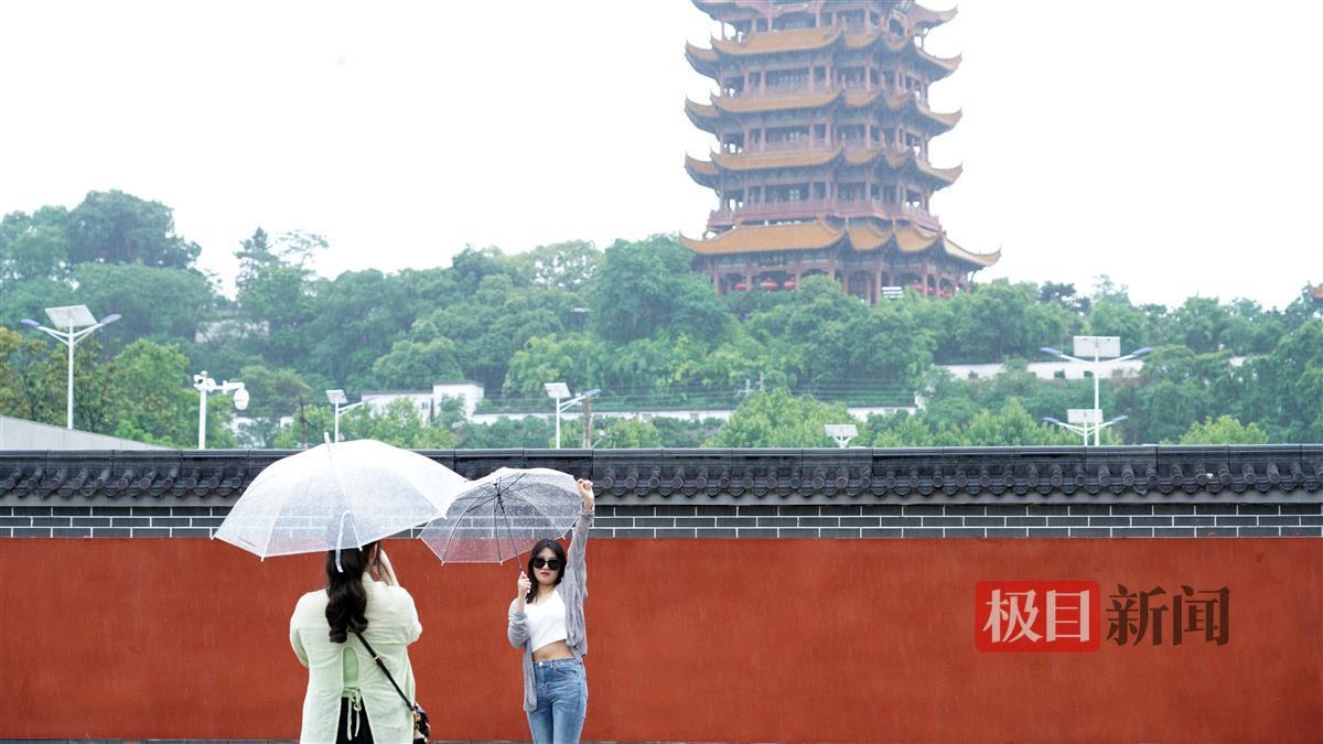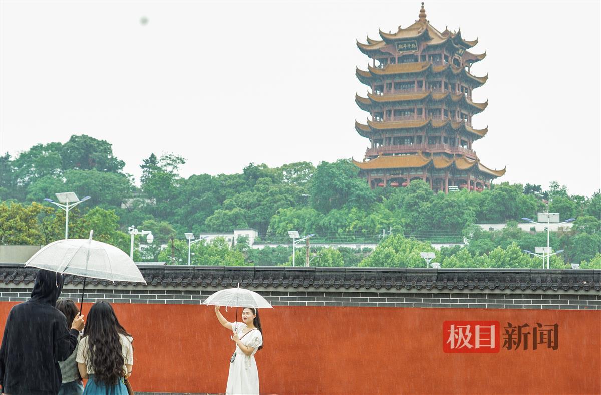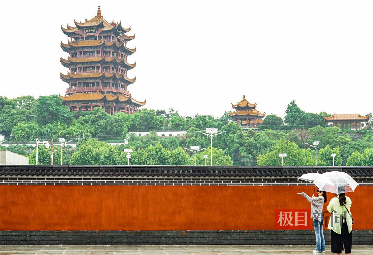 不少游客冒雨来打卡,以红墙为背景与黄鹤楼同框