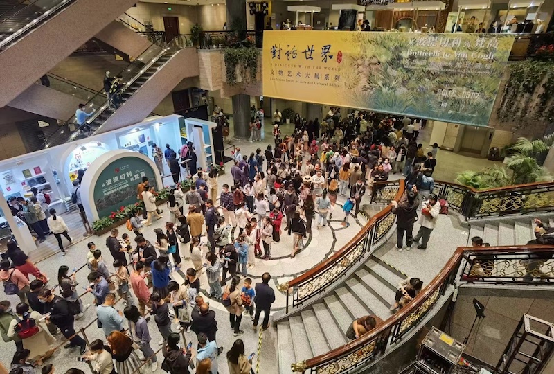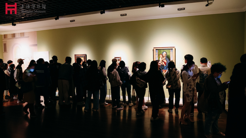 夜间,上海博物馆大厅内,排长队等待看英国国家美术馆珍藏展的观众
