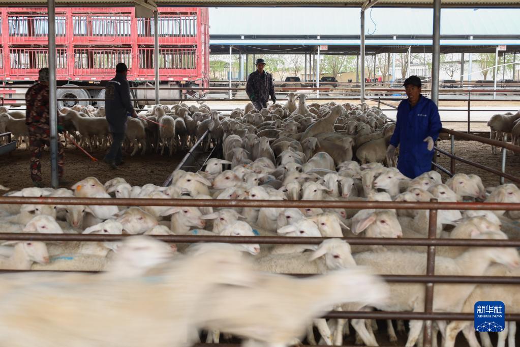 5月7日,在古浪森茂牛羊交易市场,工作人员将活羊装车。新华社记者 林立平 摄