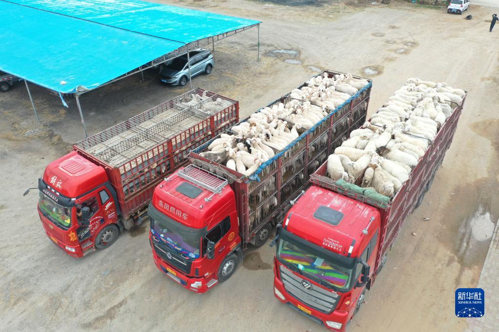 5月7日,在古浪森茂牛羊交易市场,装运活羊的运输车准备发车(无人机照片)。新华社发