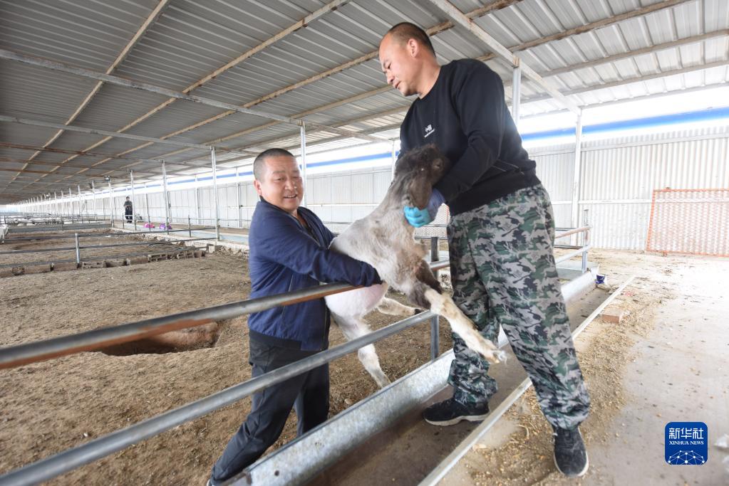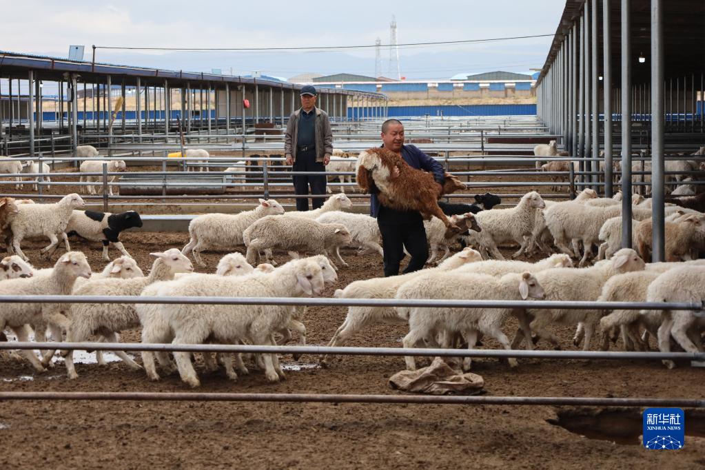 5月7日,在位于古浪县大靖镇现代养殖产业园的春旭农牧专业合作社,养殖人员捉羊去剪羊毛。新华社记者 马希平 摄