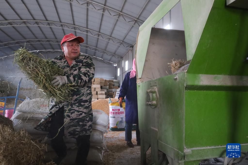 5月7日,在位于古浪县大靖镇现代养殖产业园的春旭农牧专业合作社,养殖人员在给羊准备饲草。新华社记者 马希平 摄