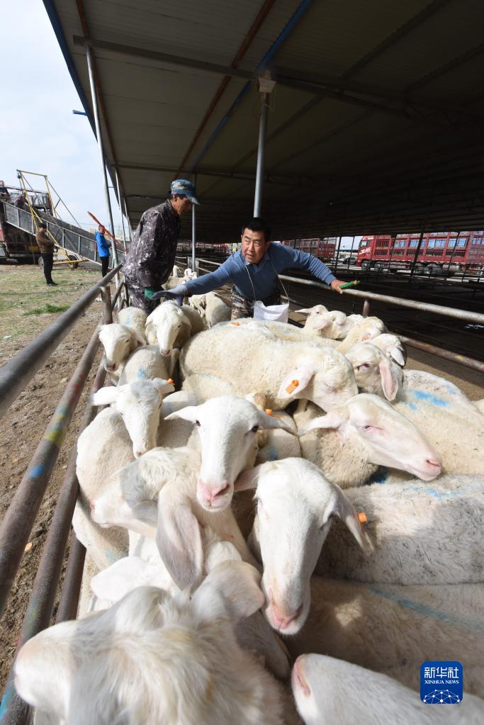 5月7日,在古浪森茂牛羊交易市场,工作人员赶羊装车。新华社记者 马希平 摄