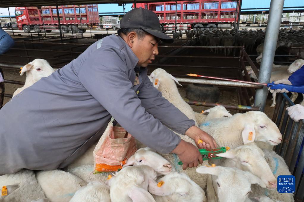 5月7日,在古浪森茂牛羊交易市场,工作人员给羊打耳标。新华社记者 马希平 摄