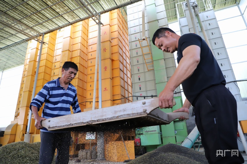 曾广巴和张军为新收割的油菜籽进行二次分筛(央广网发梁欣摄)