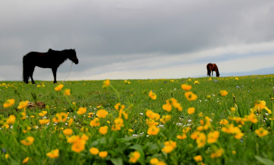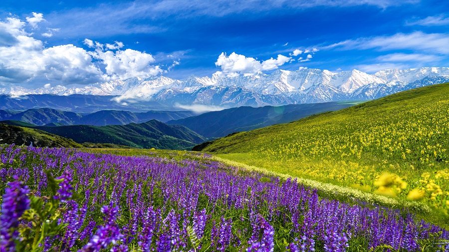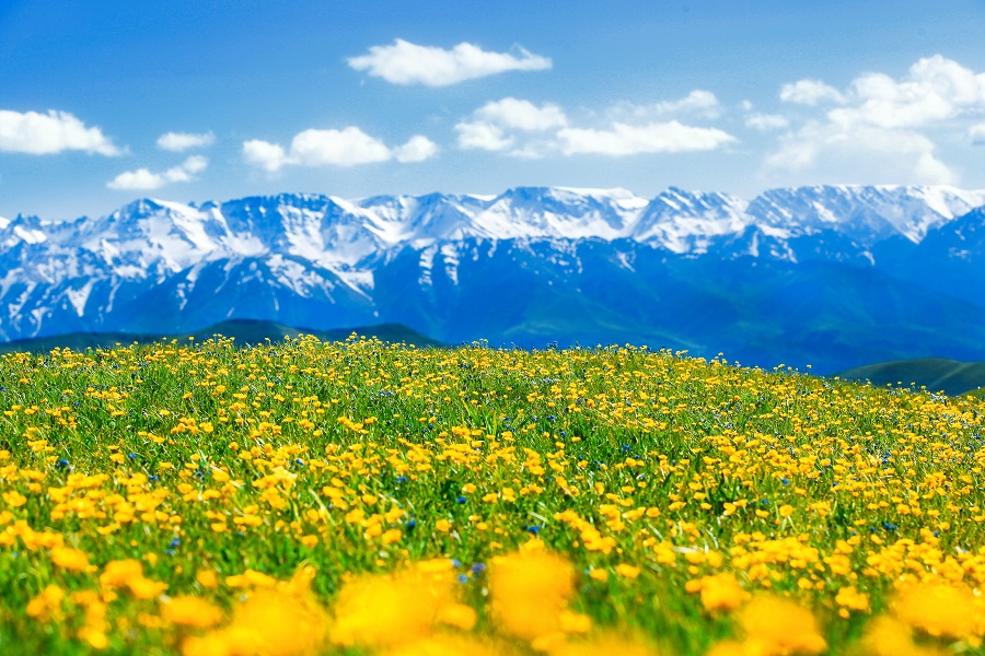 吐尔加辽草原绿草如茵、生机盎然,盛开的花儿与远处的雪山相映成趣,美不胜收。各种野花从每年的四月依次绽放,连绵5个多月。