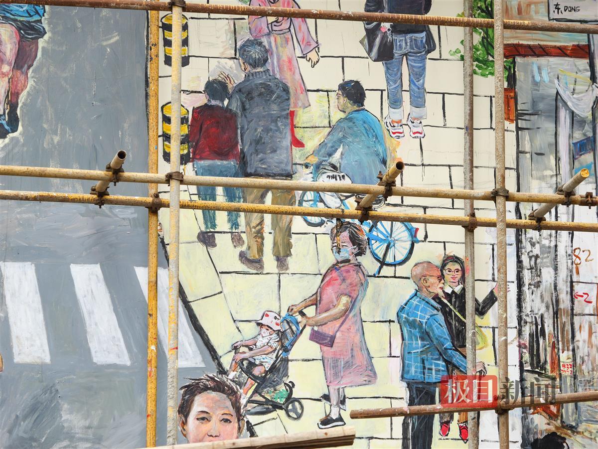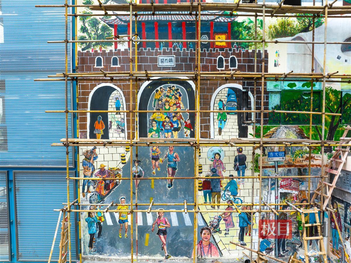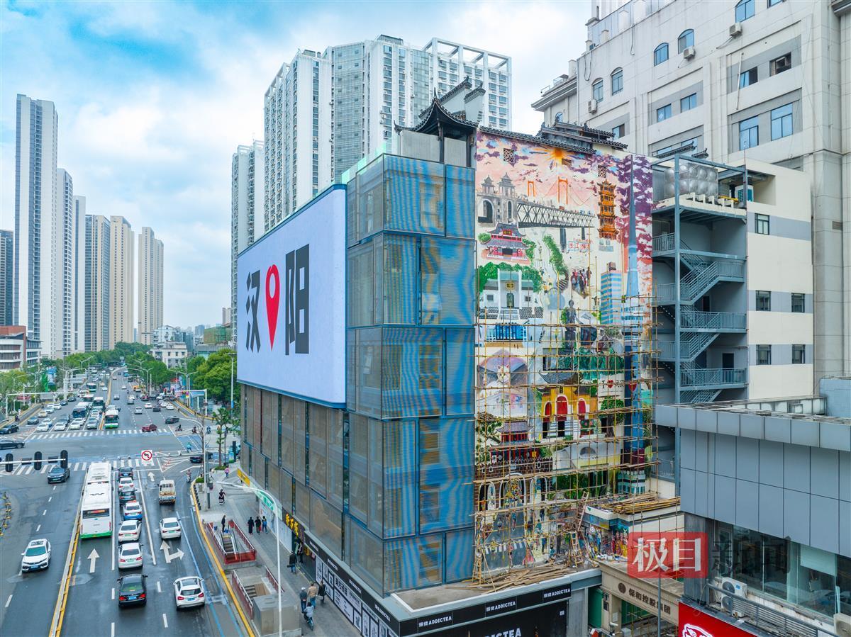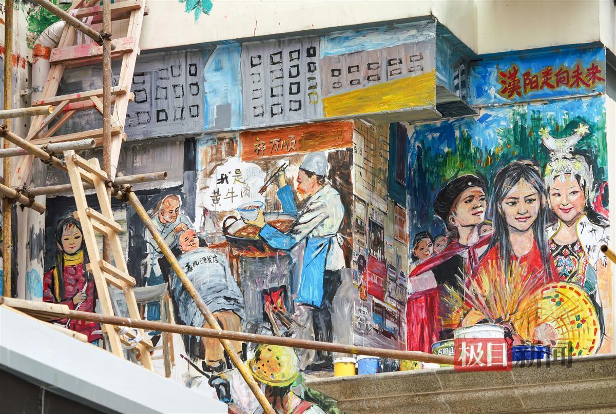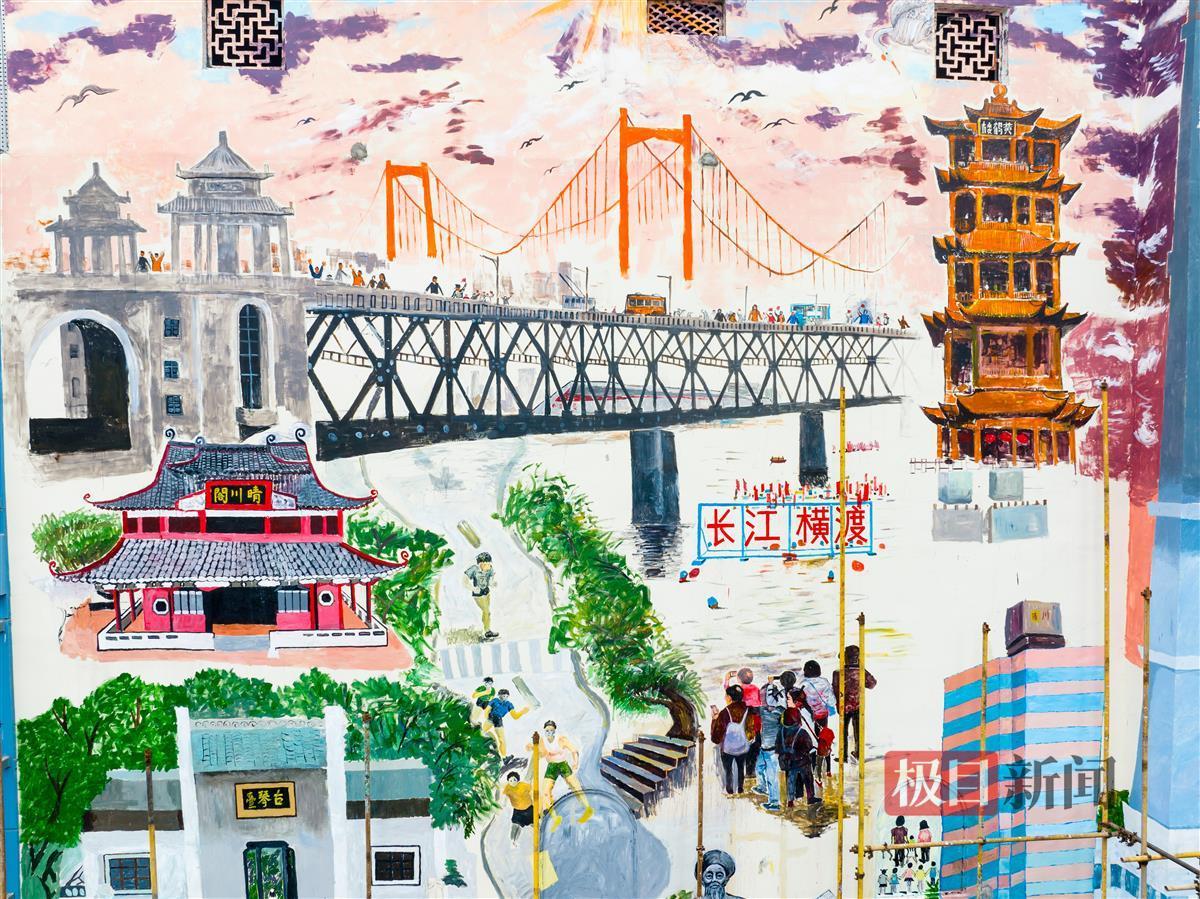 极目新闻记者在现场看到,长江大桥、古琴台、铁门关、晴川阁和充满烟火气的市井生活场景跃然墙上。