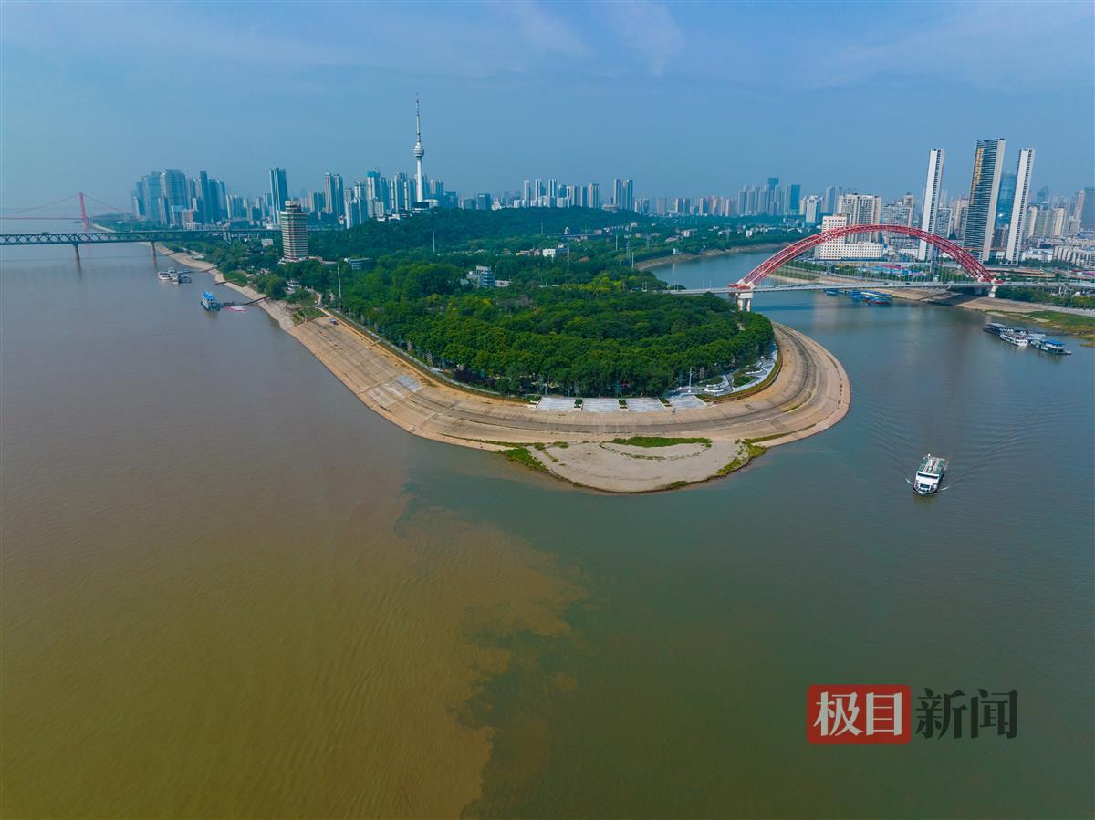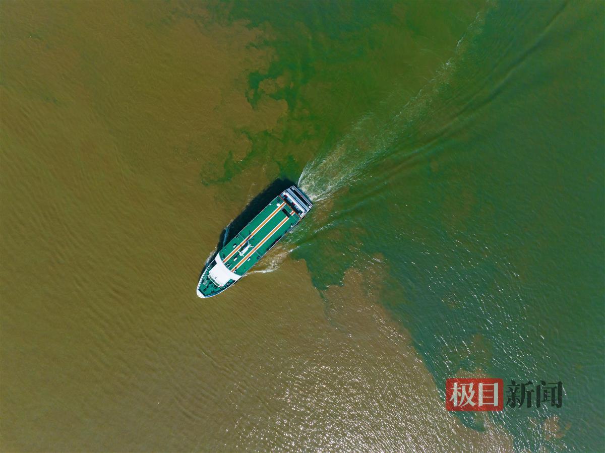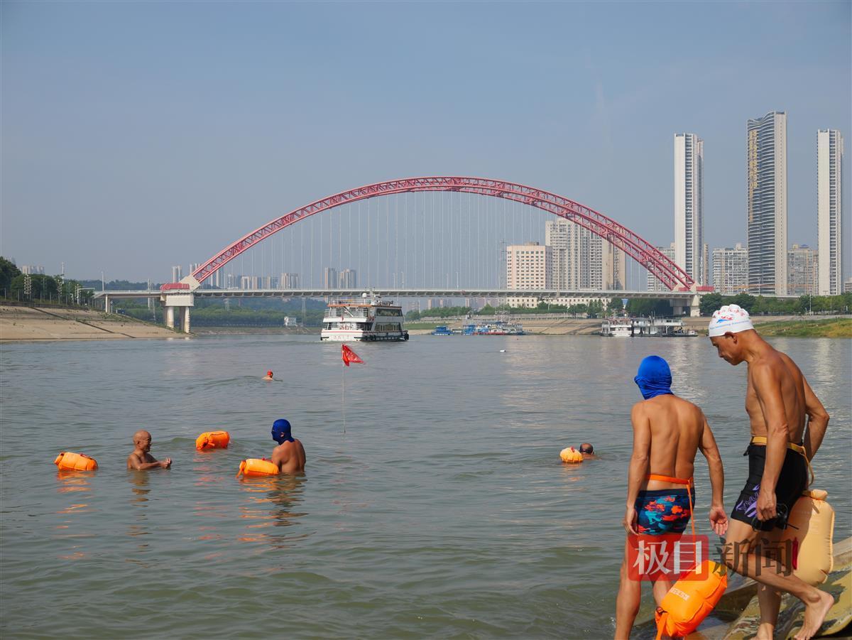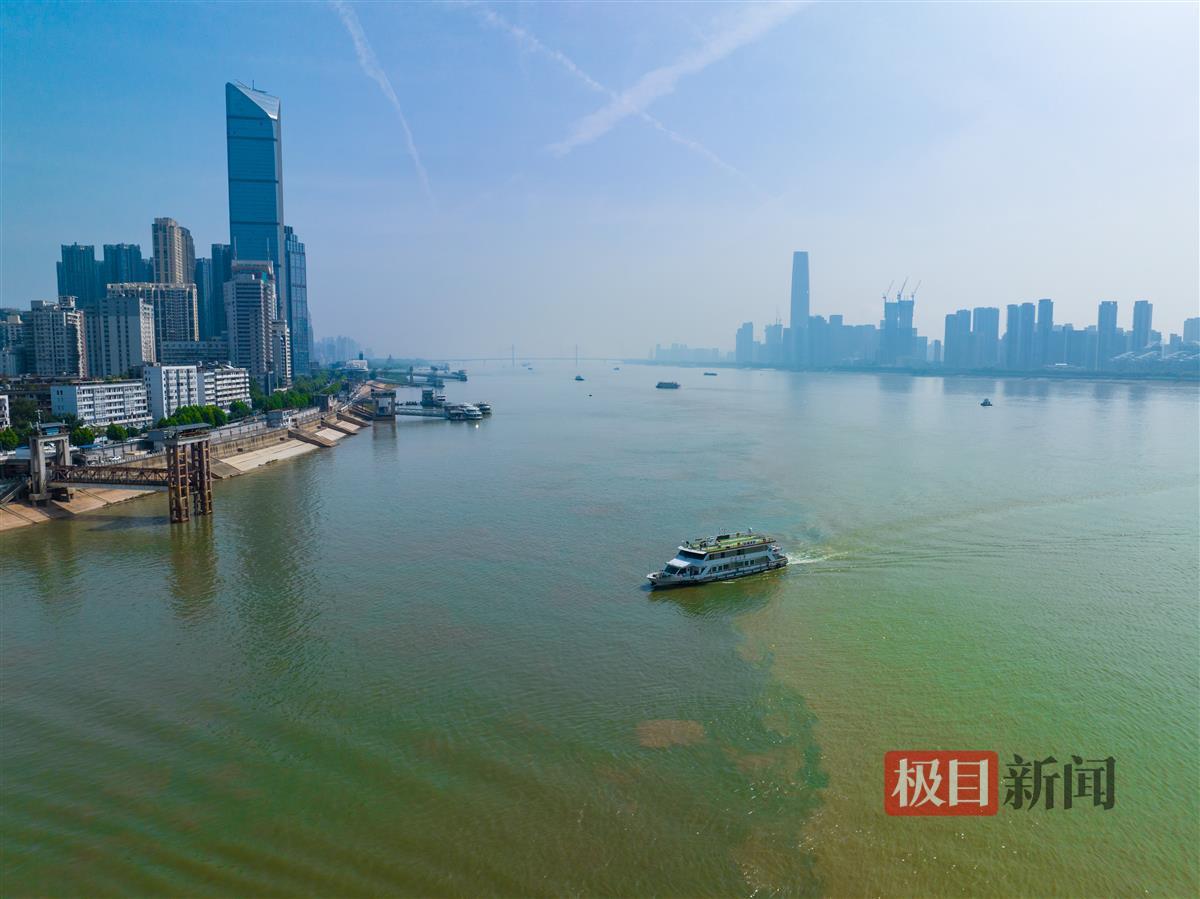 极目新闻记者在汉口龙王庙两江交汇处看到,由于上游流量上升,携带泥沙量增多,长江水颜色明显偏黄,与偏绿的汉江水形成“泾渭分明”的对比效果。集家嘴码头附近,不少游泳爱好者在汉江中戏水。