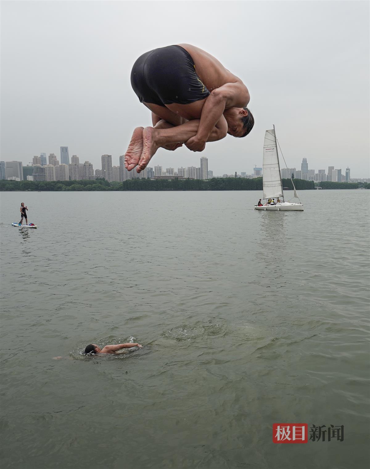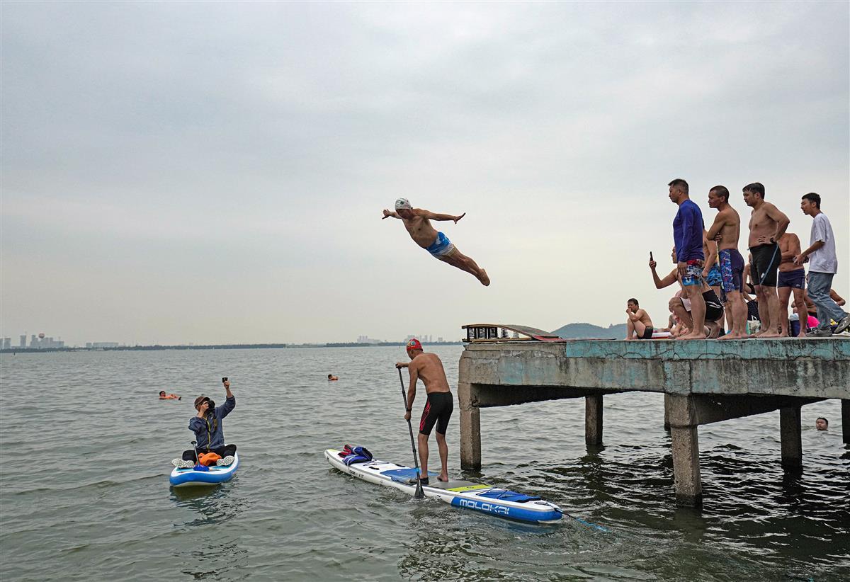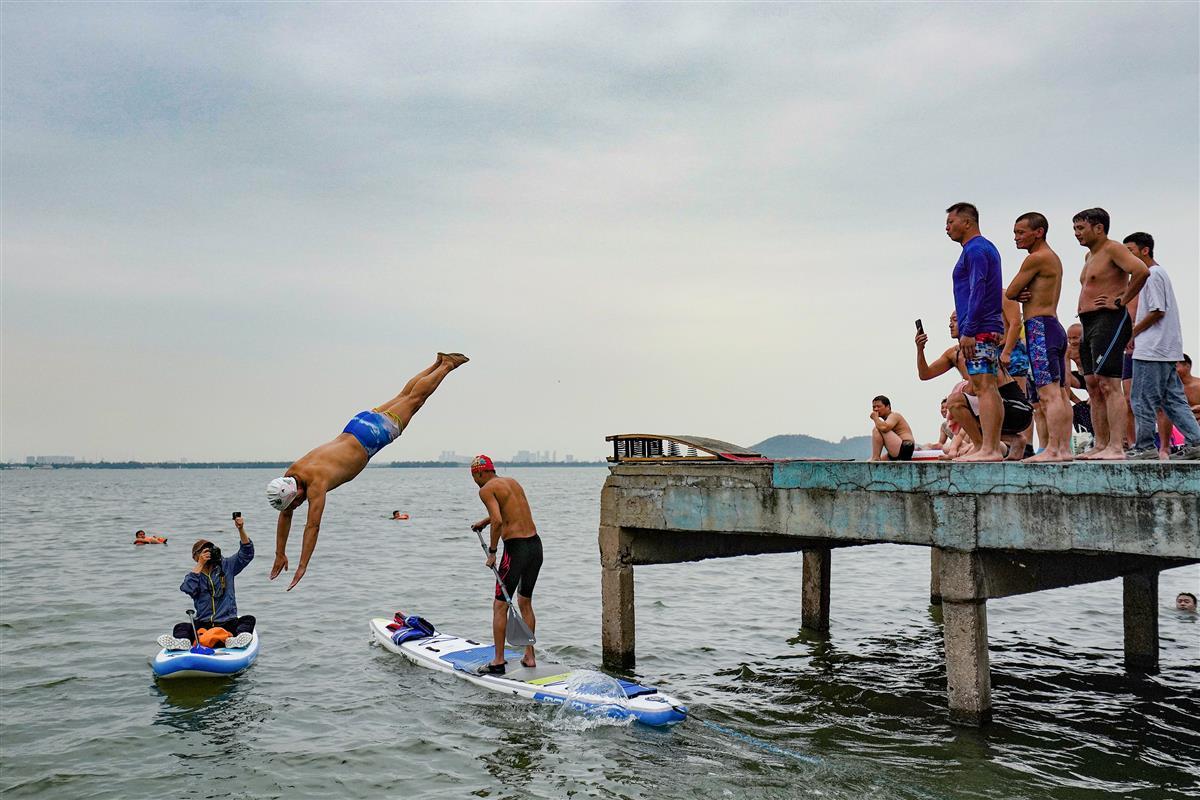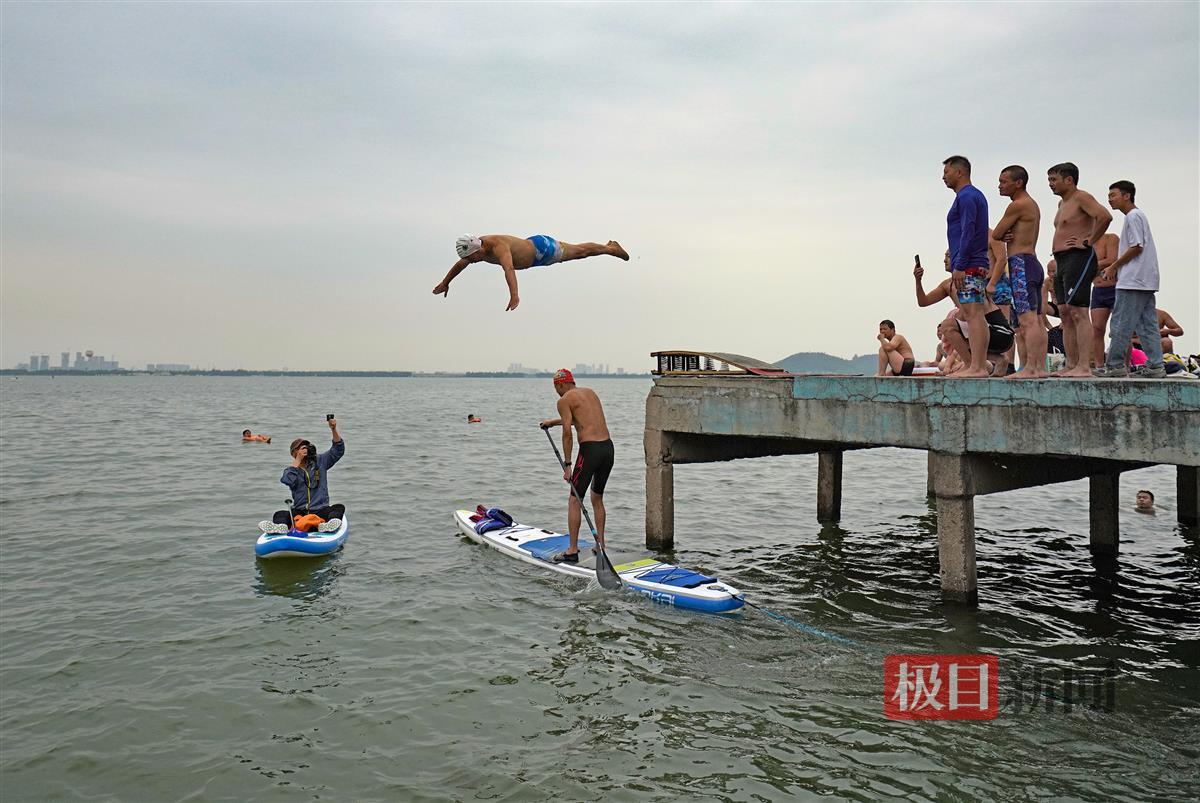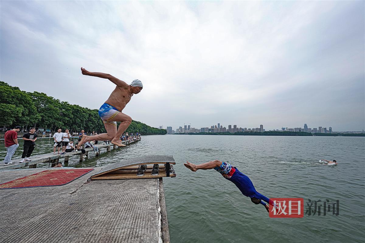6月3日,一群跳水爱好者在东湖凌波门跳水平台跳水。从小就在东湖跳水,至今已有50年跳水经验的孙先生介绍:这群老少爷们最大的60多岁,最小的20多岁。他们因为相同的爱好相聚在一起,一起跳东湖,跳长江。那种在空中飞翔般的感觉让人上瘾。