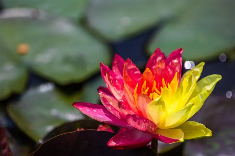 现代快报讯(记者张然)你见过一花双色、红黄相间的睡莲吗?近日,在南京玄武湖公园环洲假山瀑布池中,一朵双色睡莲引人驻足,在墨绿的荷叶衬托下,盛放的花朵一半金黄、一半玫红,甚是娇艳。