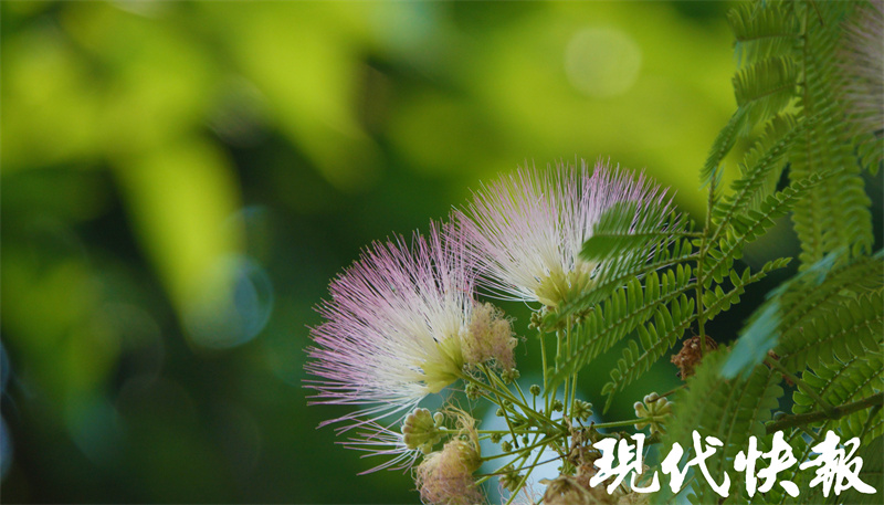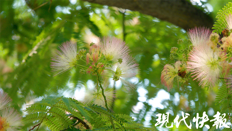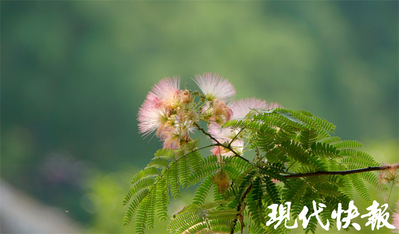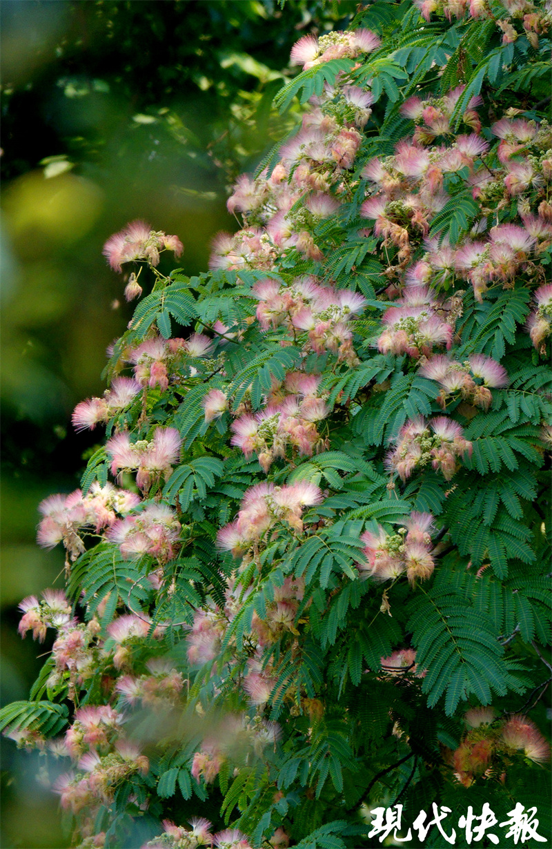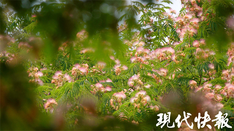 现代快报讯(记者史童歌/文赵杰/摄)“合欢花开庭草芳,忘忧花开池水光。”6月是合欢花盛开的季节。眼下,南京街头巷尾的合欢树上挂满了扇子状的小绒花,远远望去灿若云霞,增添一抹专属夏日的粉色浪漫。