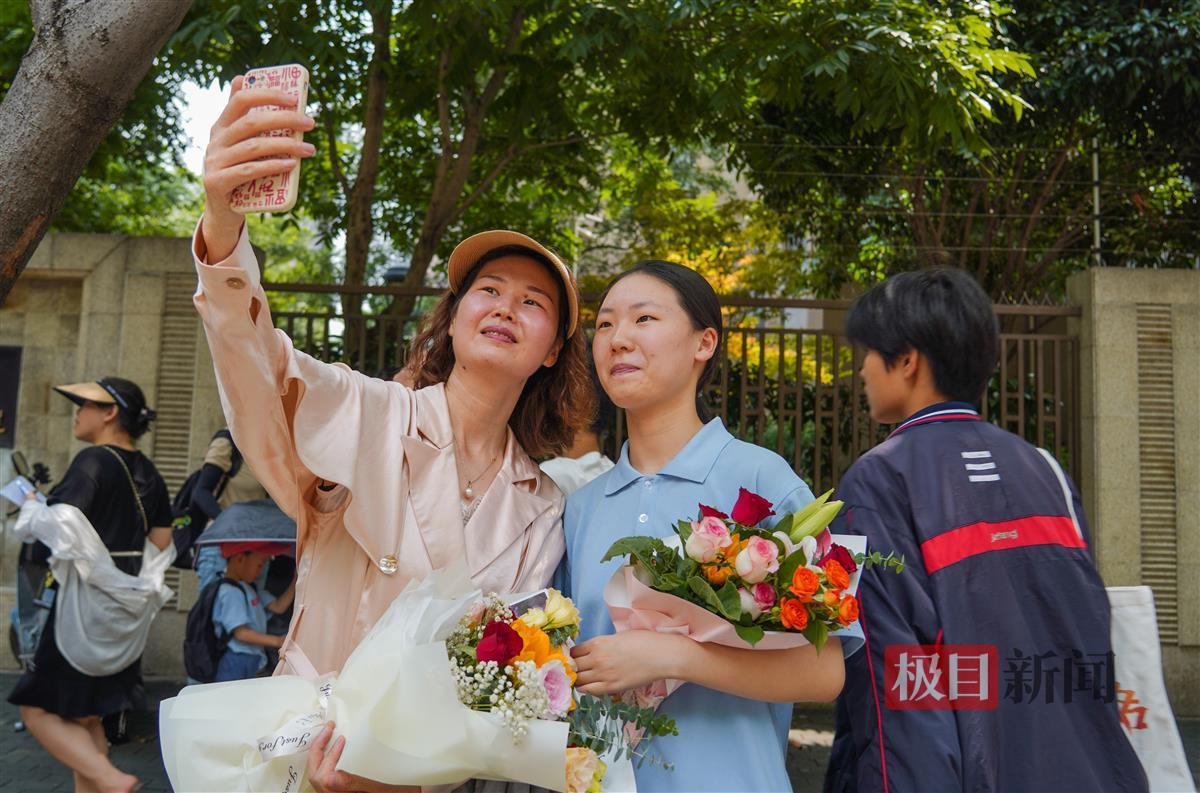 走出考场后,一家长与孩子合影纪念