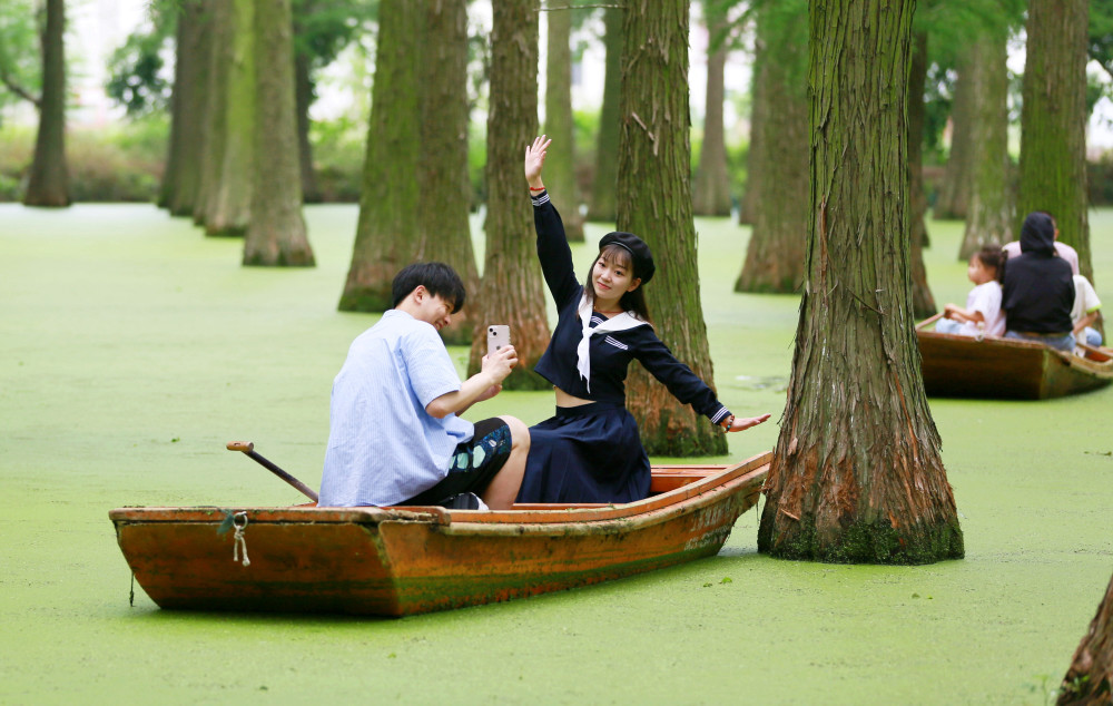6月23日,在江苏省扬州市江都区渌洋湖湿地公园“水上森林”,游客在拍照留影。新华社发(任飞摄)