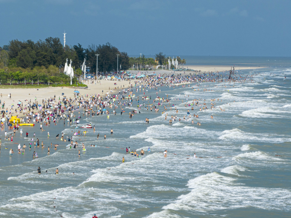 6月22日,游客在广西北海银滩国家旅游度假区踏浪休闲(无人机照片)。新华社发(李君光摄)