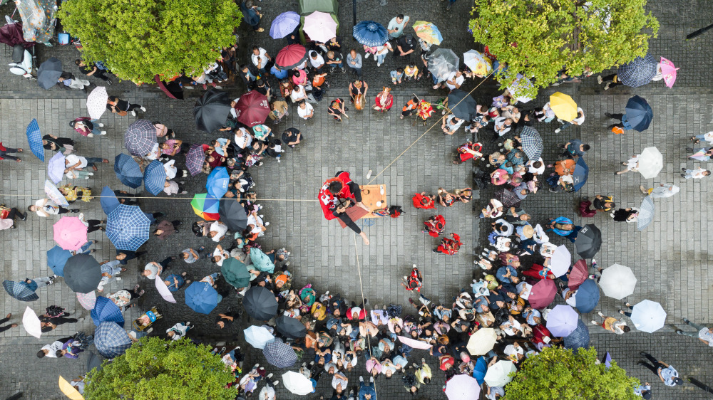 6月22日,在重庆市秀山土家族苗族自治县洪安古镇,游客在老街观看傩戏表演(无人机照片)。新华社发(胡程摄)