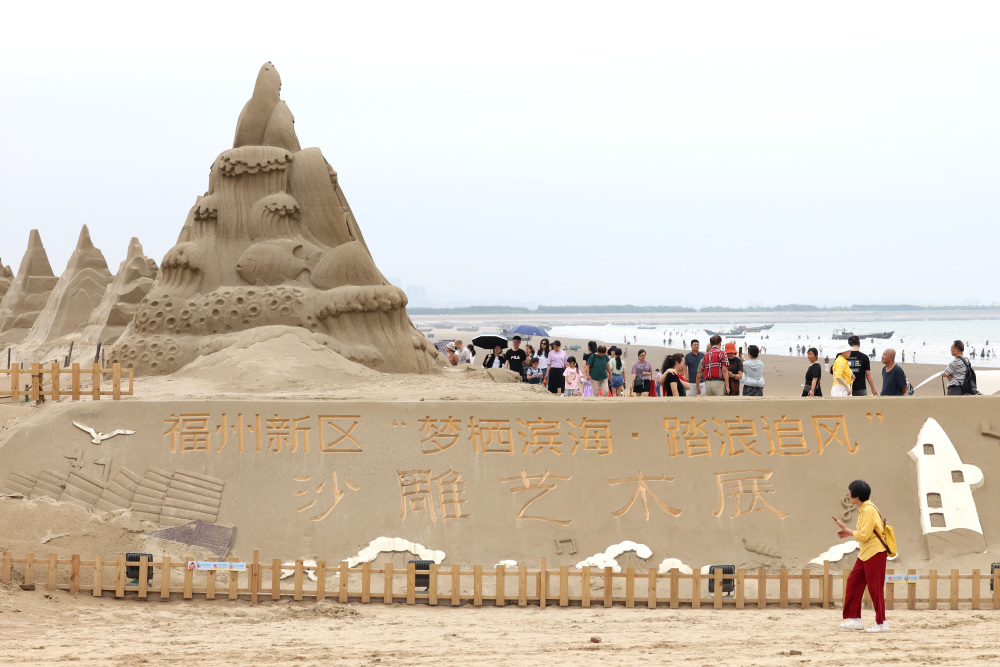 6月23日,游客在福州市长乐区江田镇下沙海滨度假村观看沙雕艺术展。新华社发(王旺旺摄)