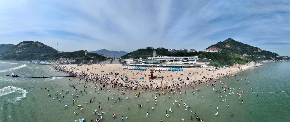6月23日,游客在江苏省连云港市连岛大沙湾海滨浴场戏水纳凉(无人机全景照片)。新华社发(王春摄)
