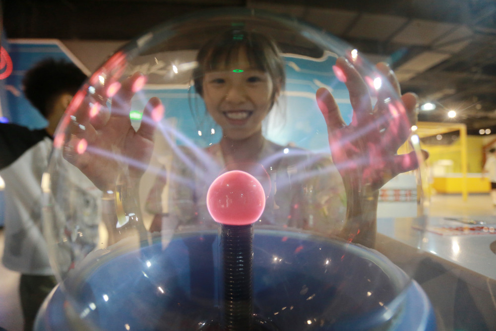 6月23日,小朋友在江苏省扬州科技馆内体验“辉光球”。新华社发(孟德龙摄)