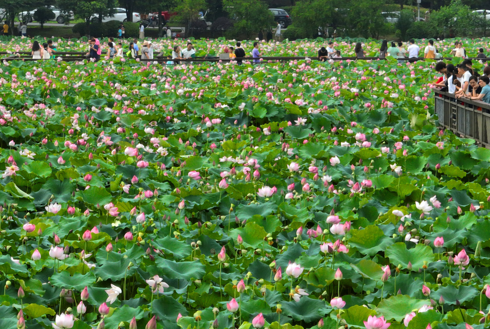 6月22日,人们在湖南省衡阳市南湖公园赏荷花(无人机照片)。新华社发(曹正平摄)