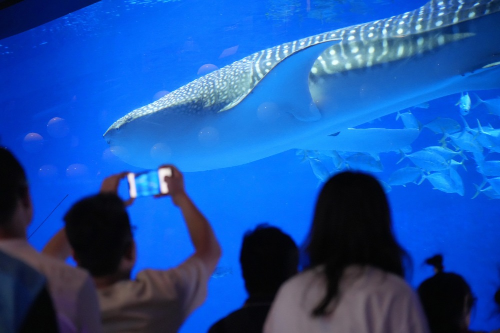 6月23日,游客在山东烟台海昌鲸鲨海洋公园观赏和拍摄海洋动物。新华社发(唐克摄)